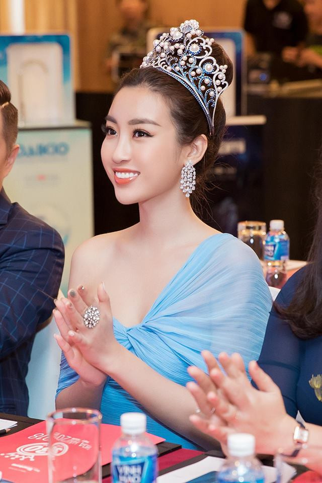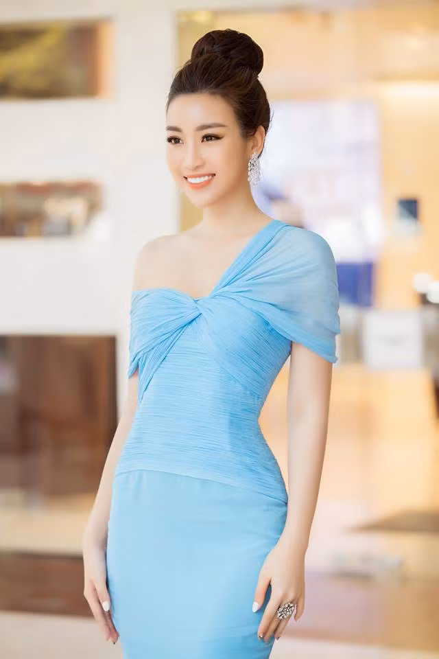 Còn Hoa hậu Đỗ Mỹ Linh, cô diện chiếc váy lệch vai không kém phần gợi cảm, khoe vòng một lấp ló. Đây là một trong những lần hiếm hoi, Hoa hậu Mỹ Linh dám hở bạo khoe vòng một của mình.