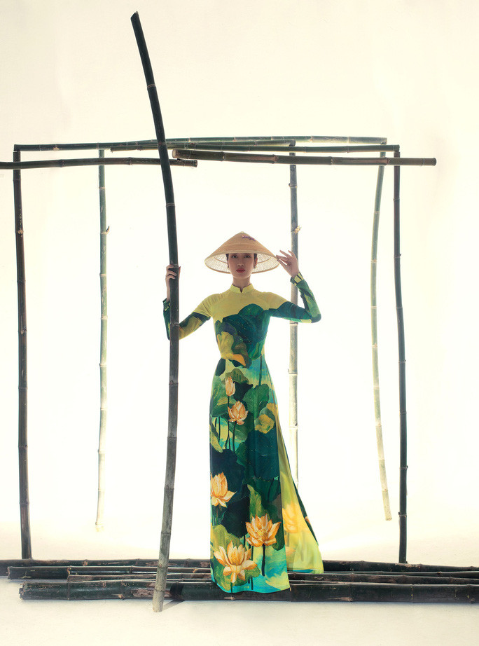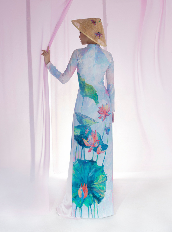 | E ấp trong áo dài hoa sen của nhà thiết kế Liên Hương |