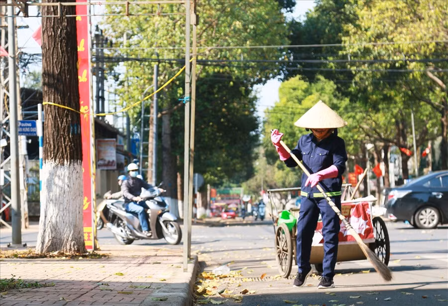 | Trái ngược với cảnh nhộn nhịp, tươi vui ở trên, đâu đó vẫn còn những công nhân lao động tạm gạt đi hạnh phúc cá nhân để miệt mài với nhiệm vụ của mình nhằm giữ cho thành phố khang trang, xanh, sạch, đẹp trong những ngày xuân. Ảnh: Bảo Trung |