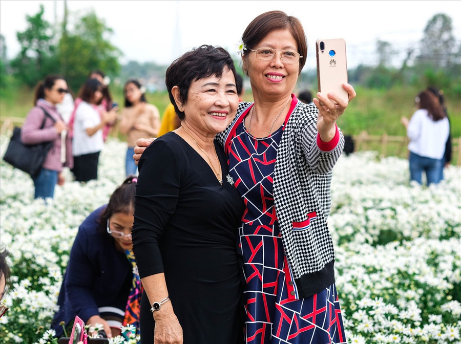 | Không chỉ các bạn trẻ, những phụ nữ trung niên và lớn tuổi cũng đến “check in” tạo dáng bên hoa cúc họa mi. |