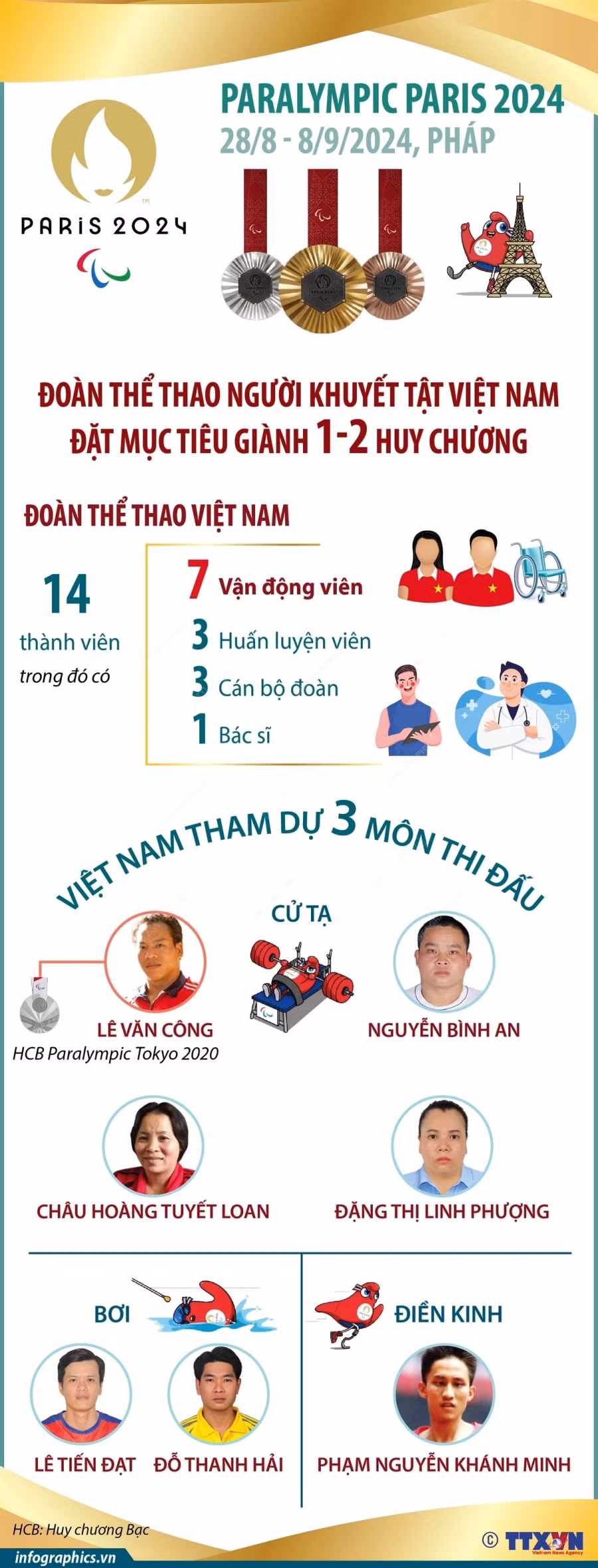 Đoàn Thể thao người khuyết tật Việt Nam tham dự Paralympic Paris 2024 với 7 vận động viên, trong đó có 5 vận động viên nam và 2 vận động viên nữ, thi đấu 6 nội dung ở 3 môn thể thao gồm: điền kinh, bơi và cử tạ.