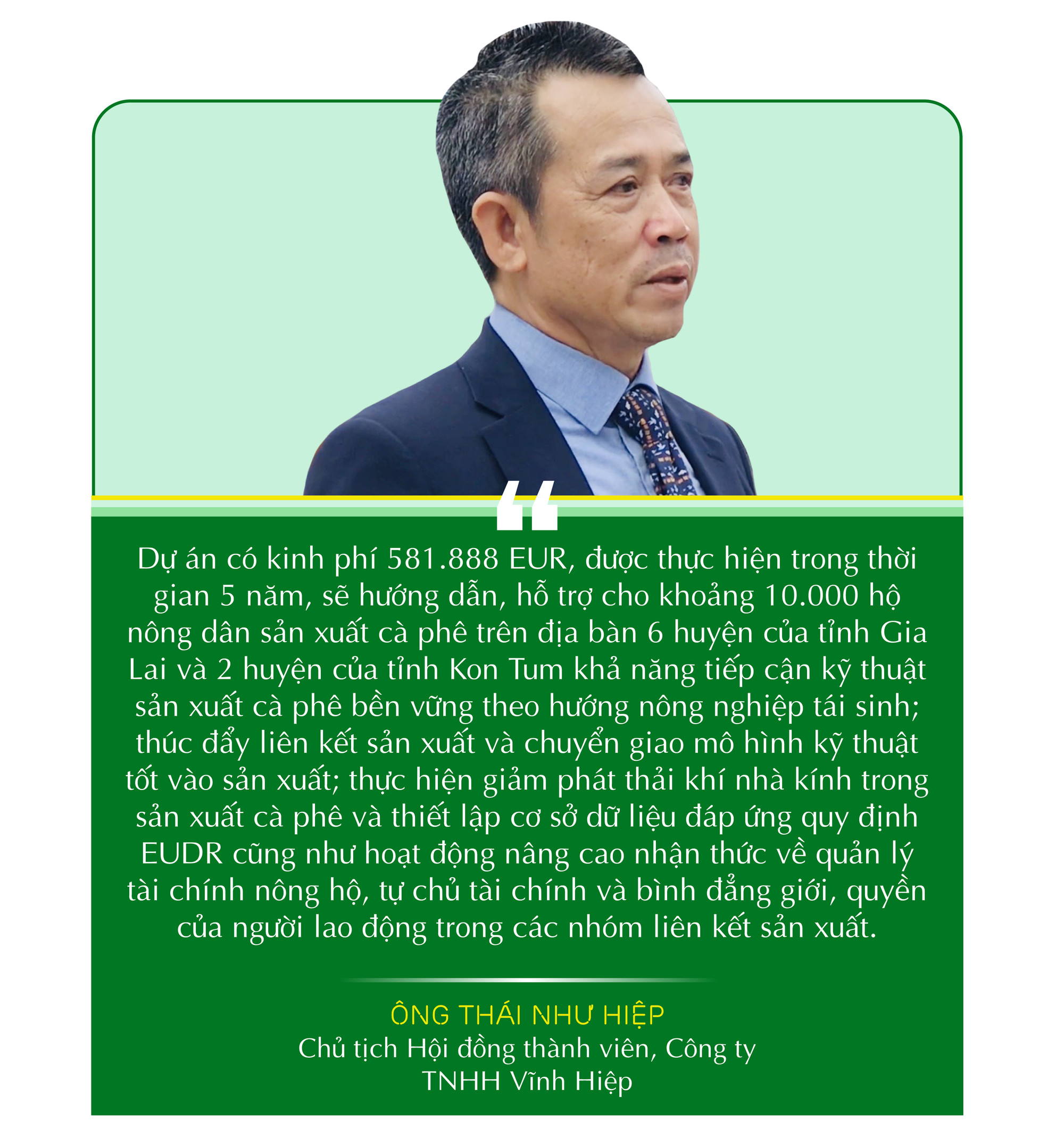 Là doanh nghiệp tiên phong trong định hướng phát triển nông nghiệp bền vững tại Việt Nam nhằm đáp ứng những yêu cầu khắt khe của thị trường và xây dựng các giá trị kế thừa, Công ty TNHH Vĩnh Hiệp cùng với Công ty JDE Peet’s khởi động Dự án “Nâng cao năng lực, cơ hội tiếp cận nguồn lực hỗ trợ sản xuất cà phê cho các cộng đồng người dân tộc bản địa; thúc đẩy phương thức sản xuất cà phê giảm phát thải khí nhà kính và tuân thủ quy định của châu Âu về không gây mất rừng (EUDR) trên địa bàn tỉnh Gia Lai và Kon Tum”.