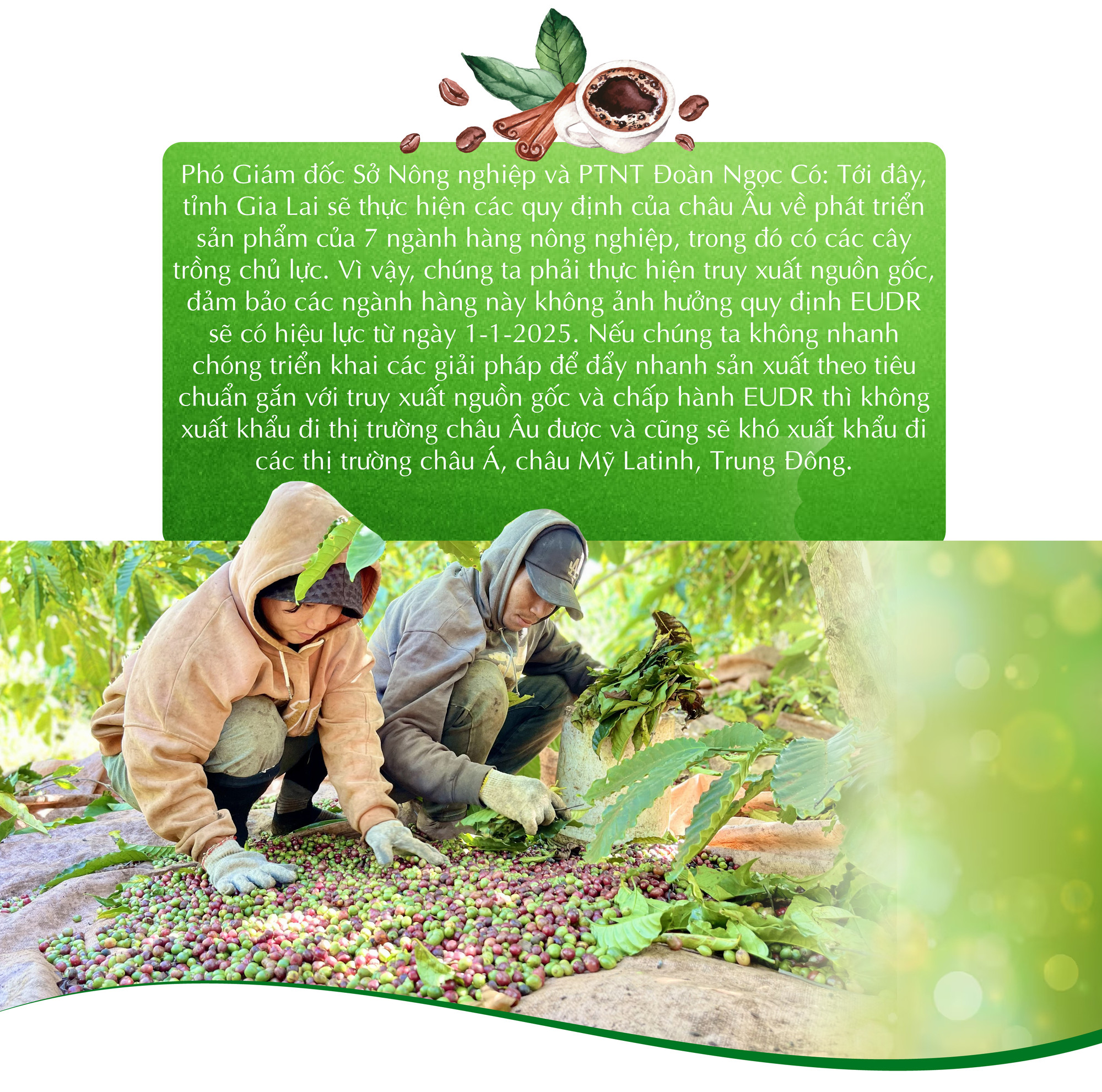 Theo ông Hiệp, hiện nay, Gia Lai đã xây dựng kế hoạch cơ cấu lại ngành cà phê để phát triển sản xuất bền vững, trong đó xác định phát triển cà phê theo các tiêu chuẩn để đáp ứng yêu cầu thị trường thế giới. Tỉnh đang nỗ lực thực hiện chứng chỉ carbon rừng và chứng chỉ carbon trên cây cà phê để thực hiện tốt các quy định của thế giới về giảm phát thải khí nhà kính cũng như thực hiện các quy định và cam kết minh bạch với EU.