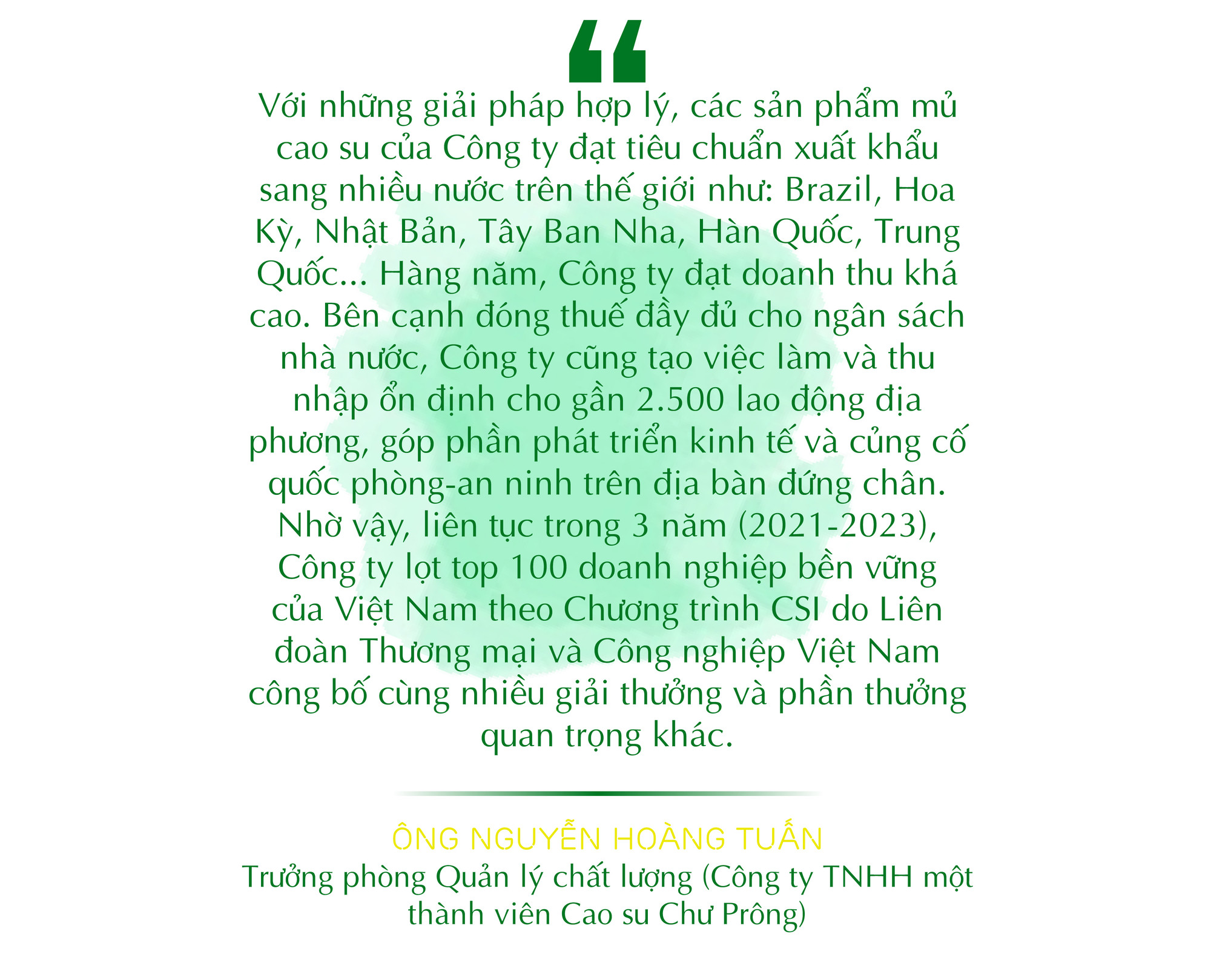 Ông Nguyễn Hoàng Tuấn-Trưởng phòng Quản lý chất lượng (Công ty TNHH một thành viên Cao su Chư Prông) cho hay: Công ty đang quản lý trên 8.322 ha cao su và hàng năm tự khai thác với sản lượng 7-9 ngàn tấn để chế biến các loại mủ xuất bán ra thị trường. Công ty xác định phương châm cốt lõi trong phát triển sản xuất kinh doanh là dựa trên 3 yếu tố: kinh tế, môi trường và xã hội. Để đạt được kết quả này, từ năm 2020 đến nay, Công ty lần lượt xây dựng và đạt được các chứng nhận: Hệ thống quản lý chất lượng theo tiêu chuẩn ISO 9001:2015; Hệ thống quản lý môi trường ISO 14000:2015; Hệ thống quản lý phòng thí nghiệm theo tiêu chuẩn ISO/IEC 17025:2017; Hệ thống chuỗi hành trình sản phẩm từ vườn cây tới nhà máy chế biến cao su theo tiêu chuẩn PEFC ST 2002:2020 và Hệ thống quản lý rừng bền vững theo tiêu chuẩn FM/VFCS ST 1003:2019.