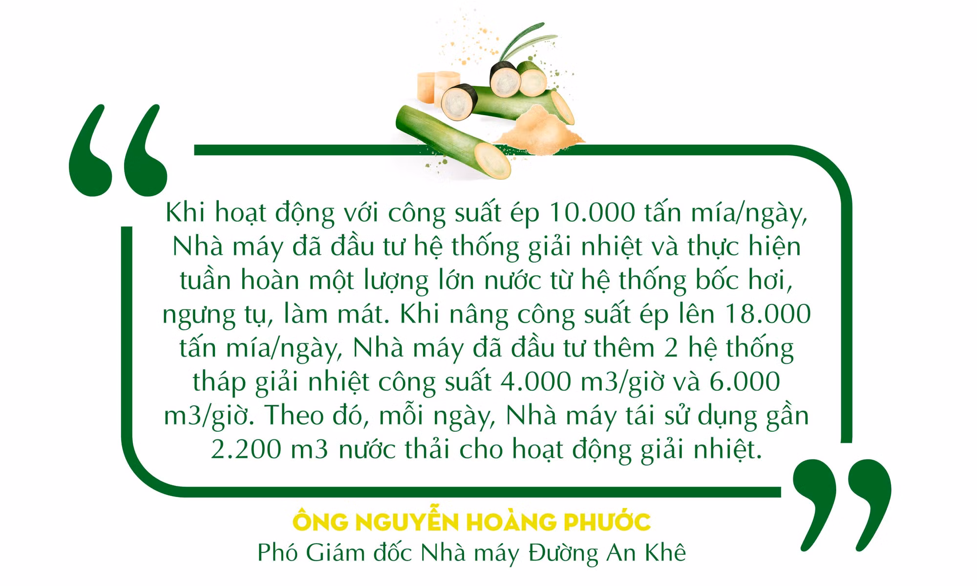 Bên cạnh xây dựng nhà máy sản xuất điện sinh khối để giảm thiểu việc đưa bã mía ra môi trường, Nhà máy Đường An Khê cũng thực hiện tái tuần hoàn nước thải để tiết kiệm chi phí, tài nguyên nước và hạn chế xả nước thải ra nguồn tiếp nhận. Phó Giám đốc Nhà máy Đường An Khê cho biết: Hiện nay, lượng nước thải phát sinh từ hoạt động sản xuất của Nhà máy là 2.964 m3/ngày đêm. Nhà máy đã đầu tư gần 33,5 tỷ đồng để xây dựng, nâng cấp hệ thống xử lý nước thải, lắp đặt các trạm quan trắc tự động, liên tục nước thải, khí thải. Trong đó, hệ thống xử lý nước thải có công suất 8.400 m3/ngày đêm xử lý nước thải đạt cột B và được kiểm soát về chất lượng nguồn nước đảm bảo đạt quy chuẩn trước khi xả thải ra môi trường thông qua hoạt động trạm quan trắc tự động, liên tục. Để tiết kiệm chi phí và tài nguyên nước, Nhà máy đã thực hiện tái tuần hoàn nước thải.