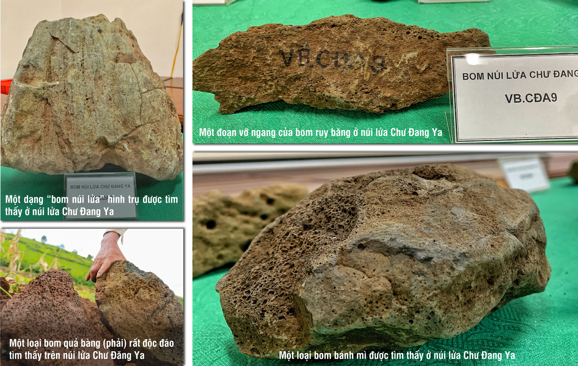 Chuyên gia Lương Thị Tuất thông tin: Bộ sưu tập đầu tiên về “bom núi lửa” tại Việt Nam đang được trưng bày tại Bảo tàng Thiên nhiên mới ghi nhận khoảng 8 loại. Các nhà khoa học căn cứ hình dạng, kích thước để đặt tên từng loại như: bom quả bàng, bom dải (hay còn gọi là bom ruy băng), bom cannon, bom bánh mì… Tại khu vực núi lửa ở Chư Đang Ya, các nhà khoa học phát hiện được 6-7 loại “bom núi lửa” như vậy.
