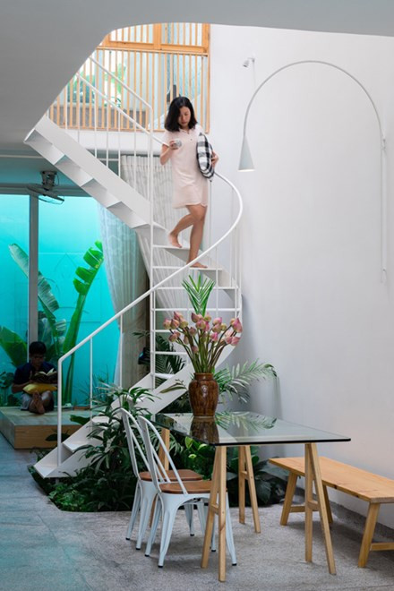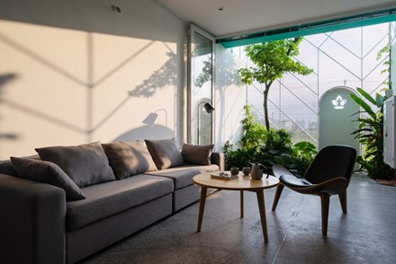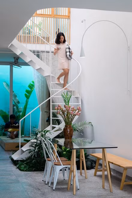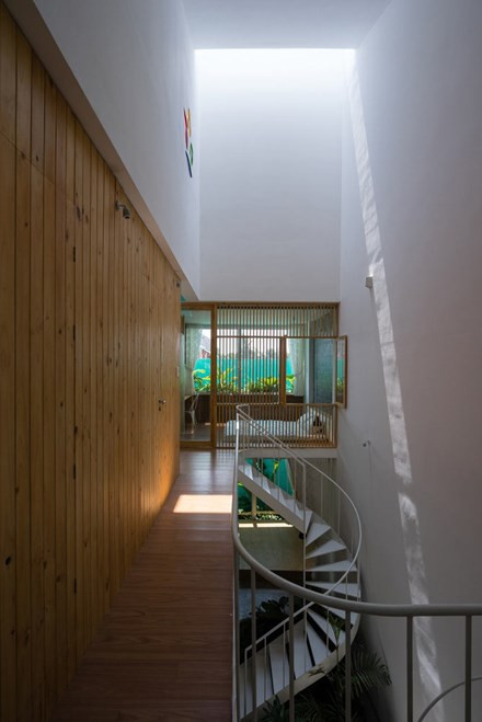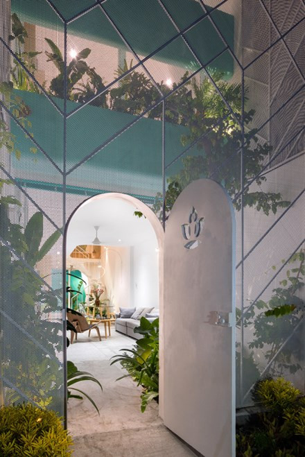 Các kiến trúc sư tạo nhiều lớp ngăn cách căn nhà với bên ngoài như: lớp thép đục lỗ, cây xanh, tường, kính.