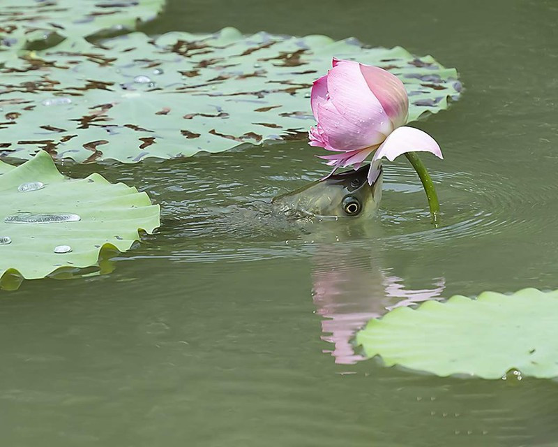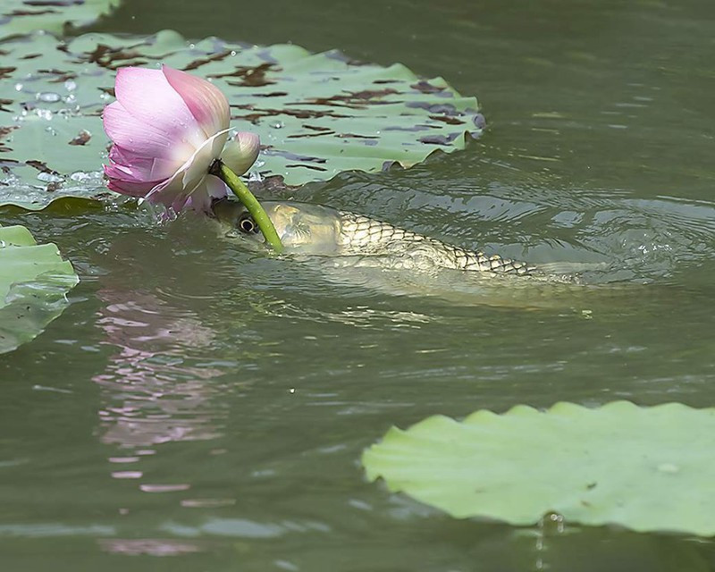 Sự thật chứng minh, sự nhạy cảm của nhiếp ảnh gia người Trung quốc là có cơ sở. Ngay khi tiếp cận được bông sen thơm ngát, trái với suy nghĩ của mọi người rằng cá chép sẽ từ tốn thưởng hoa, con cá này mạnh mẽ nhao đến, cắn thẳng vào từng cánh hoa thơm ngát, cố gắng giật đứt, nuốt vào mồm