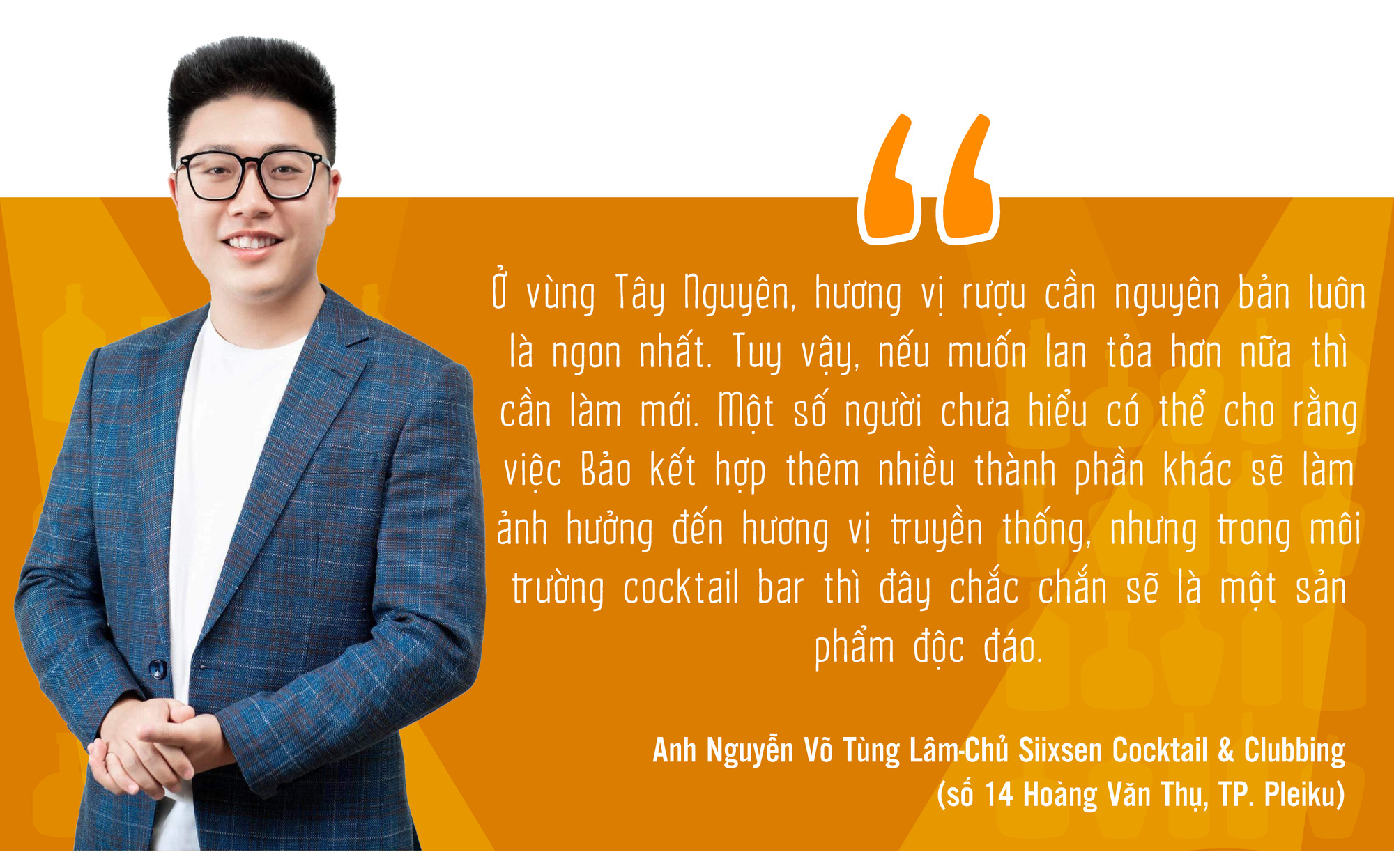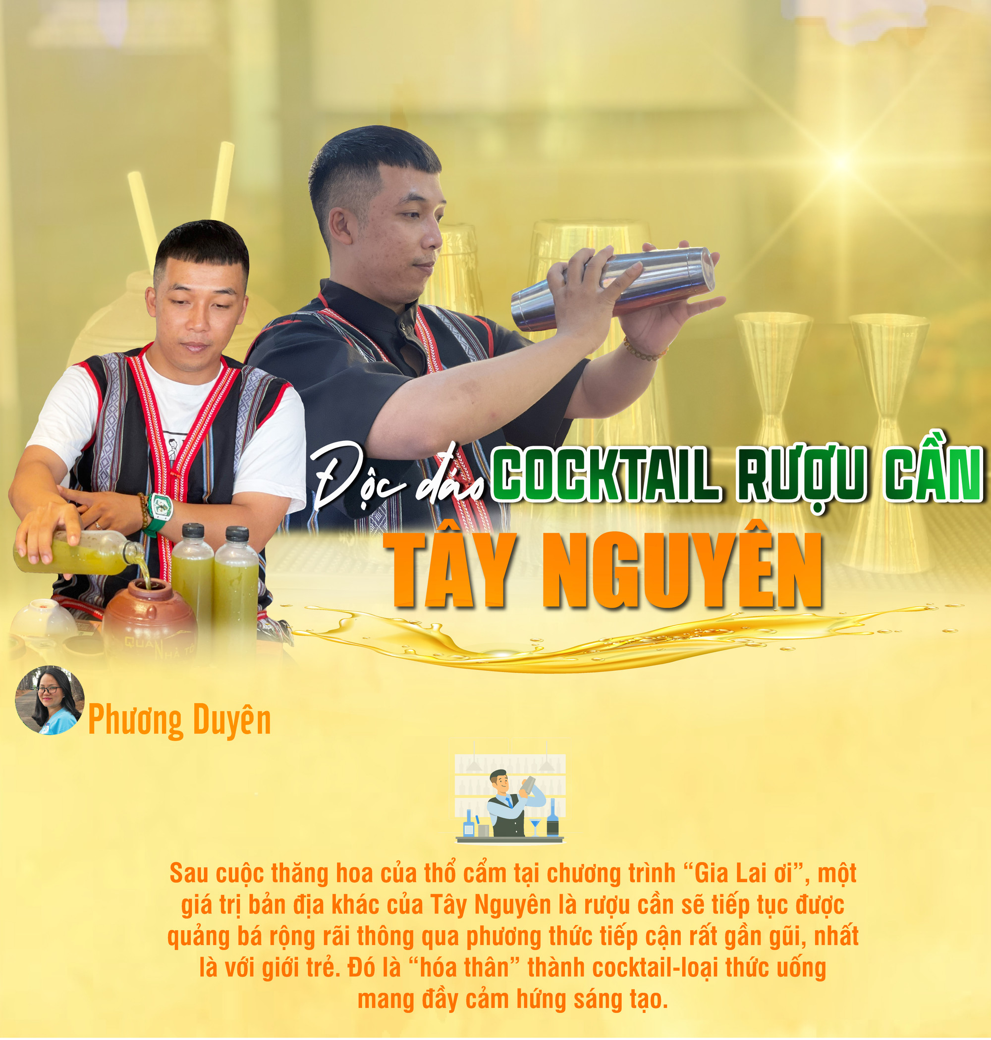 Cocktail là loại thức uống có sự kết hợp của rượu mạnh với các thành phần khác như nước ép trái cây, syrup (siro) có hương vị. Một bartender giỏi phải hiểu biết sâu sắc về các loại nguyên liệu, thành phần để pha chế thành một loại thức uống mang tính sáng tạo, xoa dịu cảm xúc. Đây không phải là lần đầu tiên Gia Bảo chọn cách “định vị” bằng những bản sắc đặc trưng của vùng đất cao nguyên. Trước đó, anh từng rất thành công với cocktail lấy cảm hứng từ hạt và hoa cà phê, muối kiến vàng… Thậm chí, không ít người phải bất ngờ thán phục khi được thưởng thức ly cocktail “phở hai tô”, mới nghe tưởng không ngon nhưng lại… ngon không tưởng nhờ sự hàm chứa đến tài tình những tinh hoa ẩm thực.