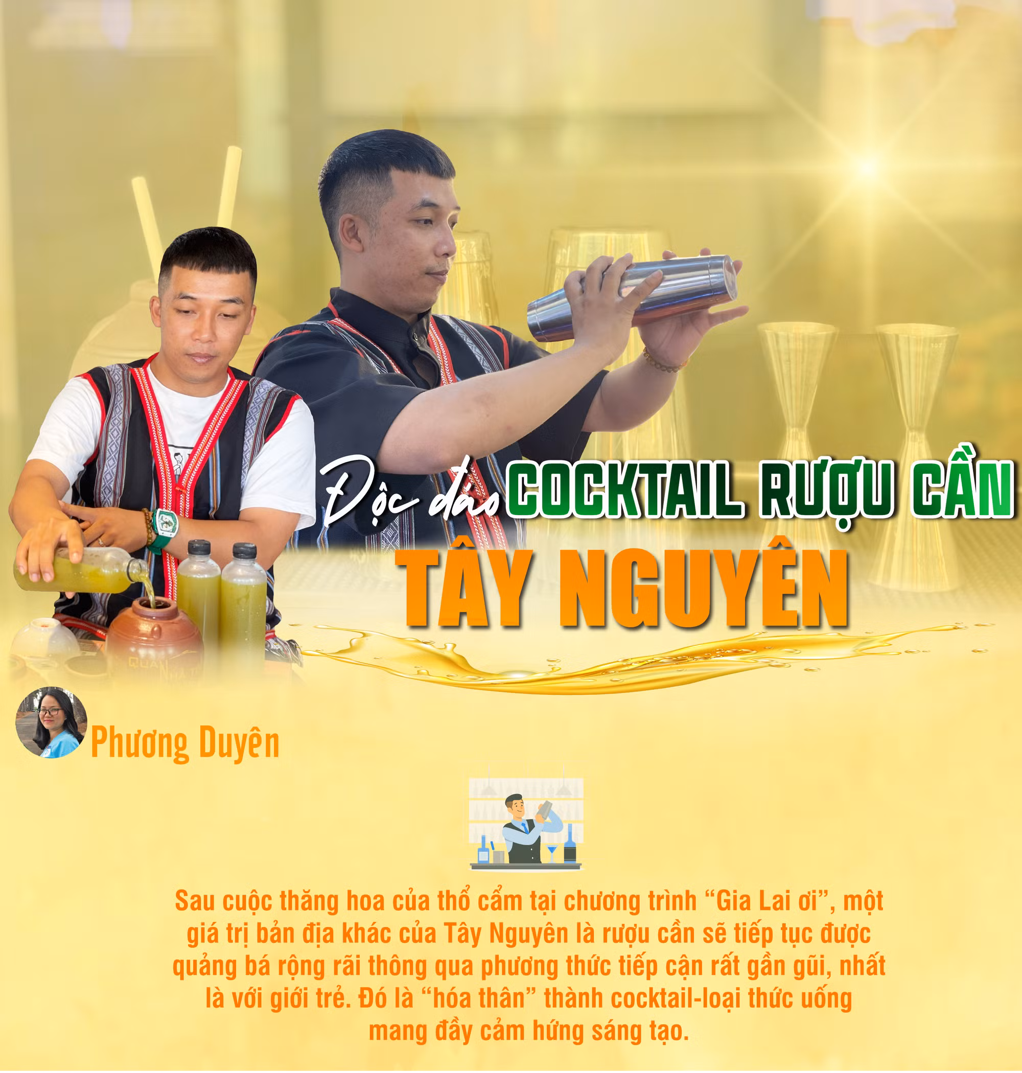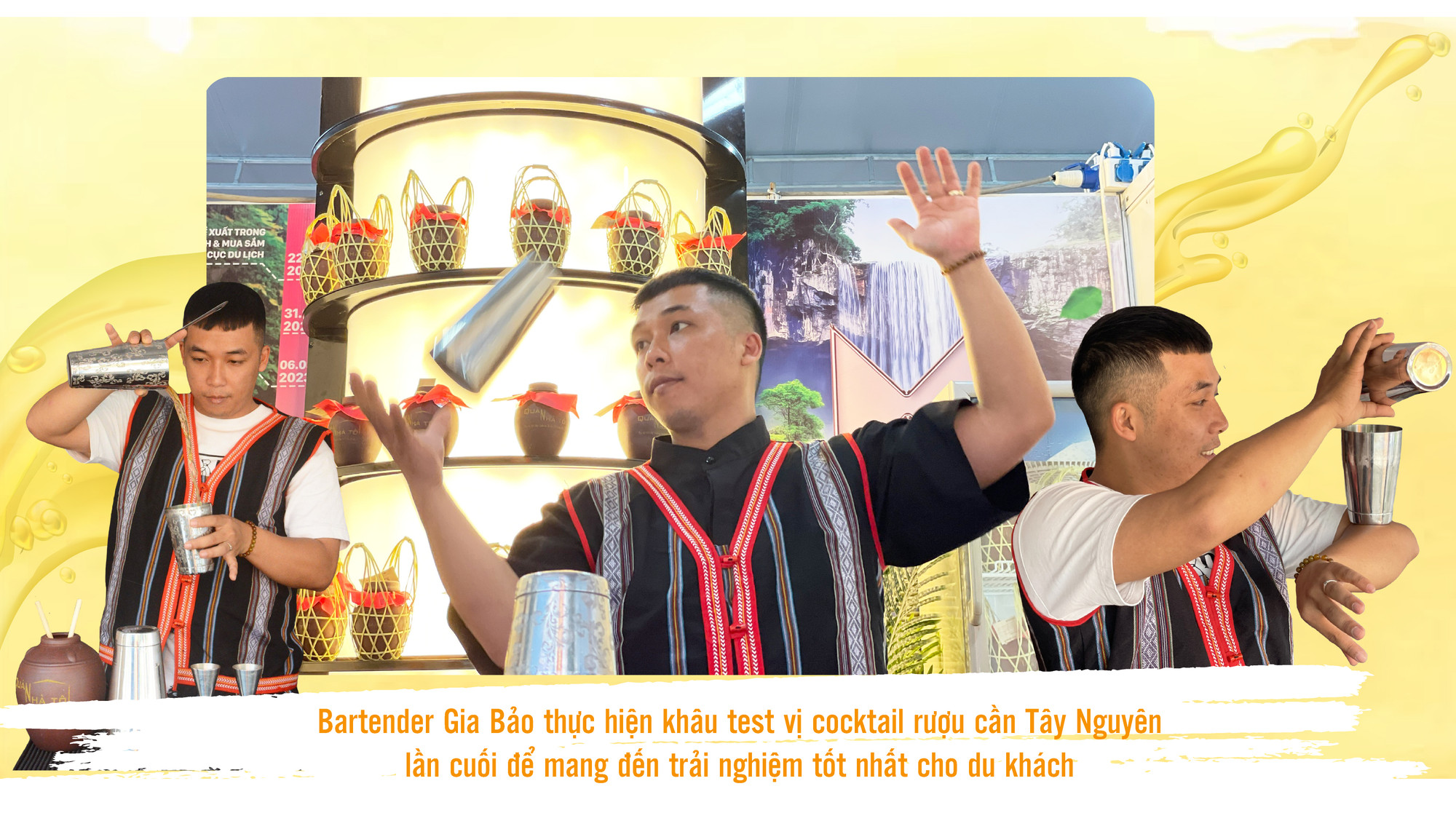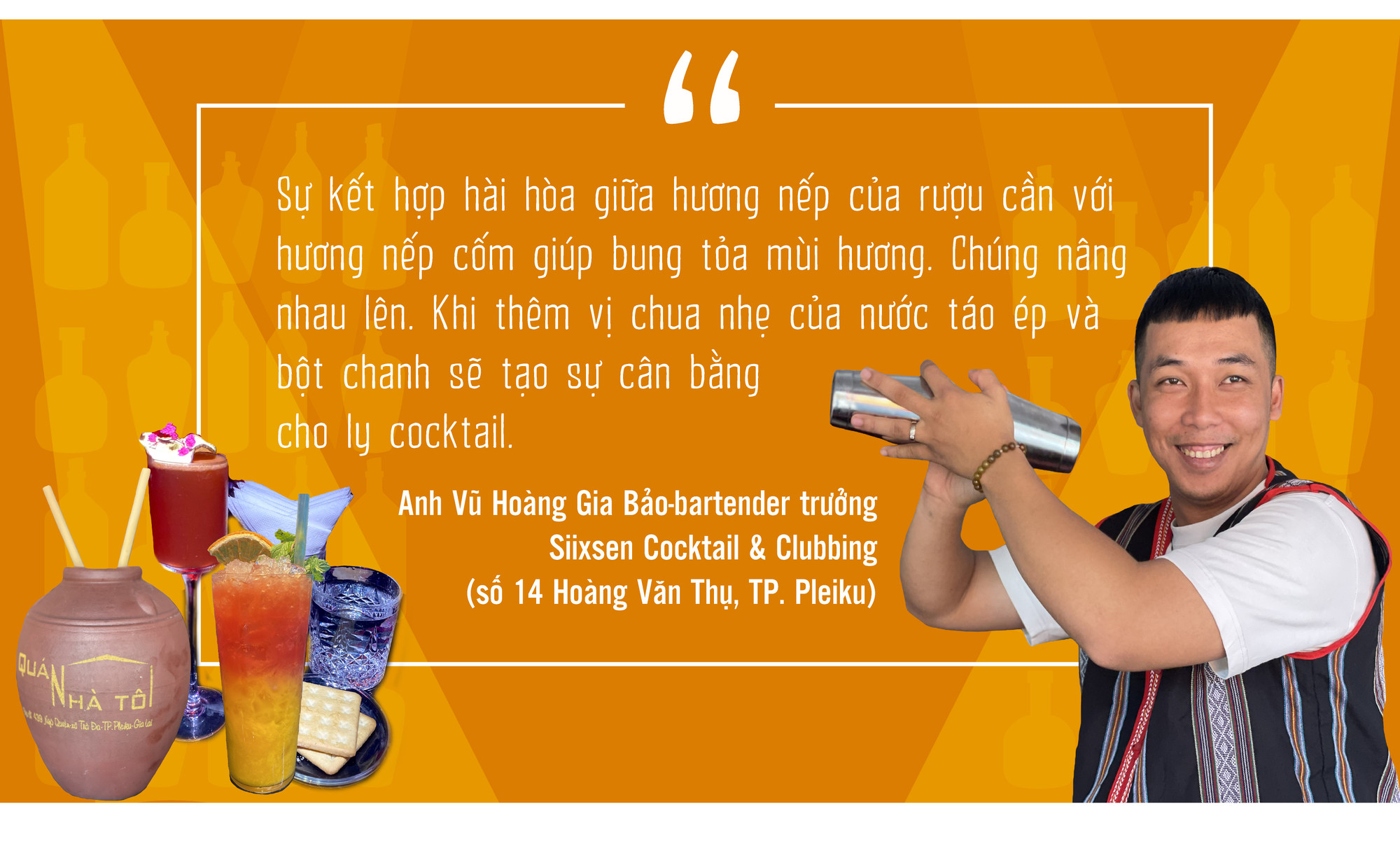 Tiếp tục phá cách, bartender này chọn rượu cần làm nguyên liệu chính để biến tấu thành ly cocktail hấp dẫn nhằm chinh phục du khách gần xa tại sự kiện Tuần Văn hóa-Du lịch Gia Lai 2023. Gia Bảo cho hay, anh phải mất một khoảng thời gian khá dài tìm kiếm loại rượu cần phù hợp trên thị trường, sau đó mày mò sáng tạo thành phần pha chế từ các loại nước ép trái cây và syrup để cho ra công thức ưng ý nhất. Đó là sự phối trộn của rượu cần, nước táo ép, syrup nếp cốm Hà Nội và một chút bột chanh. Nói về lý do chọn syrup nếp cốm Hà Nội.