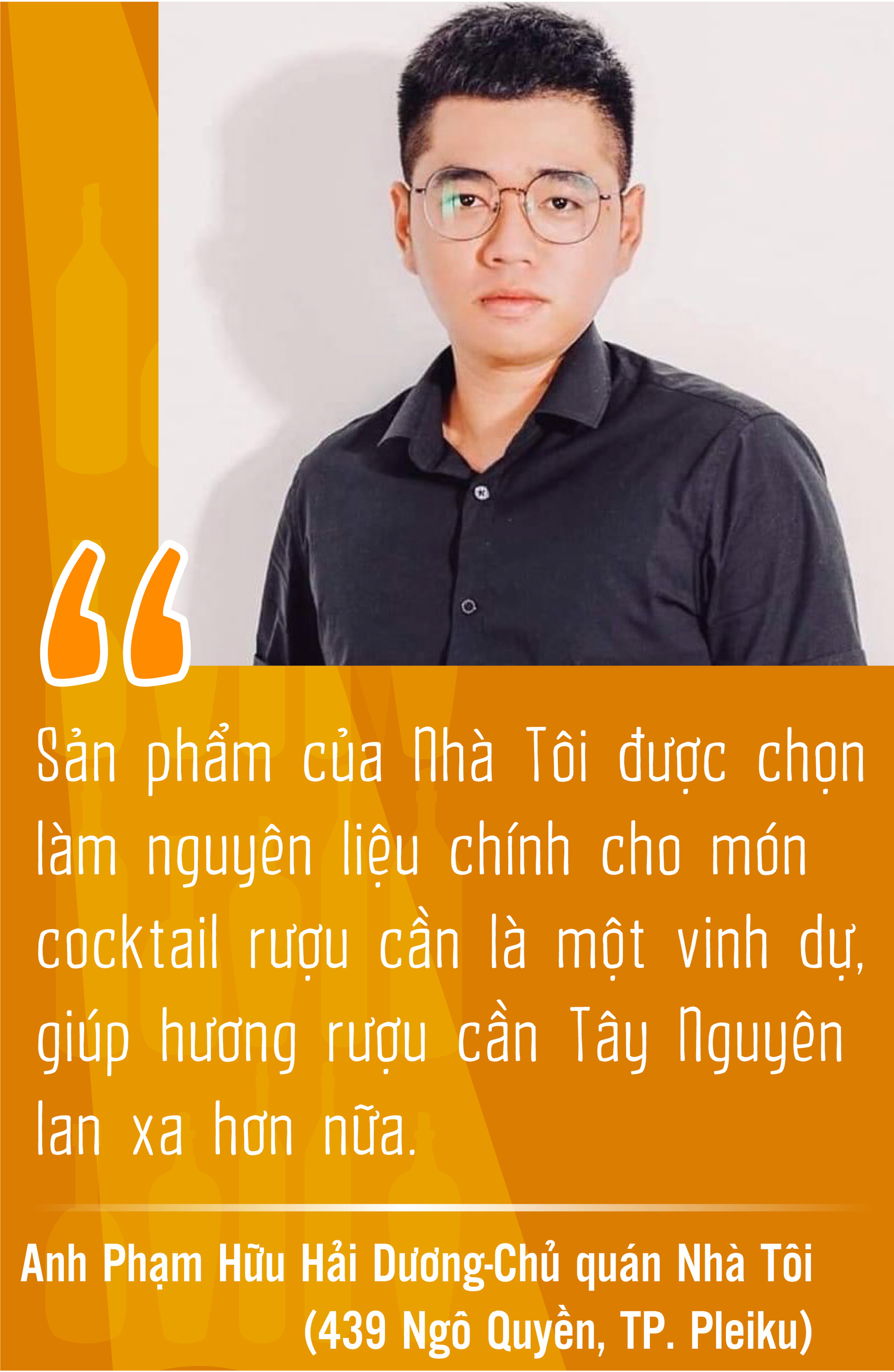 Anh Phạm Hữu Hải Dương-Chủ quán Nhà Tôi-cho hay, nguyên liệu chính của rượu cần do quán sản xuất là nếp được nấu chín, ủ với trấu và men theo một phương pháp riêng, quan trọng là đảm bảo vệ sinh an toàn thực phẩm. Nhờ vậy, sản phẩm đã được nhập vào Siêu thị Co.op Mart Pleiku khoảng 5-6 năm nay. Mỗi tháng, cơ sở bán ra vài trăm ghè kể cả nguồn từ siêu thị và tự phân phối.