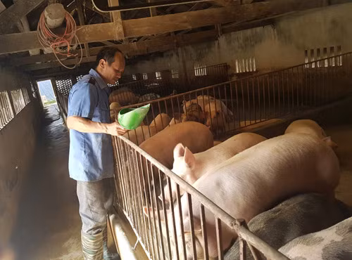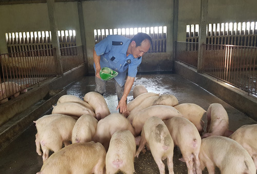 Ông Nguyễn Văn Thục ở xóm 4, xã Trực Thái, huyện Trực Ninh (Nam Định) chăm sóc đàn lợn tại trang trại của gia đình ở Nam Định. Ảnh: Hải Đăng