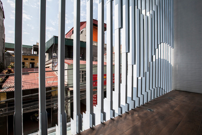 Để hạn chế ánh nắng hướng tây chiếu trực tiếp vào nhà, các kiến trúc sư đã thiết kế một hệ lam chắn nắng đặc bệt, nhìn từ bên ngoài chẳng khác nào một chiếc vỉ nướng thịt khổng lồ.