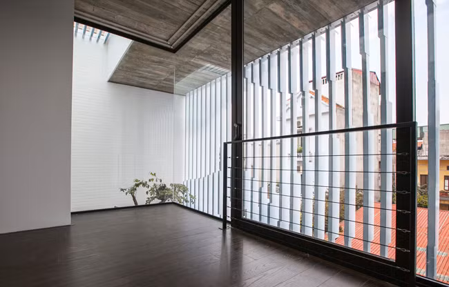 Hệ sóng mặt đứng giúp kiểm soát tính riêng tư (tránh bị nhìn từ nhà đối diện), mật độ dày hơn ở vị trí phòng ngủ và thưa hơn ở khu vực sân vườn.