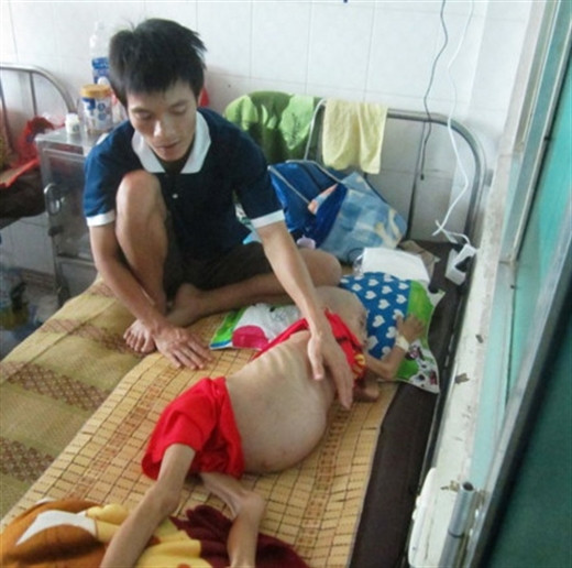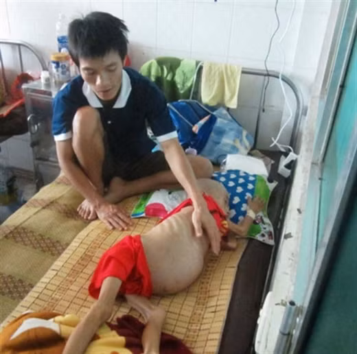 Bé trai Trịnh Quốc Hùng (SN 2011) mang khối u to chèn ép hết phần bụng và cả lồng ngực, khóc không thành tiếng. Ngồi bên, anh Trịnh Quốc Hội (SN 1984, ngụ ở tỉnh Đak Lak) sờ nắn khắp cơ thể còn đúng da bọc xương của con.