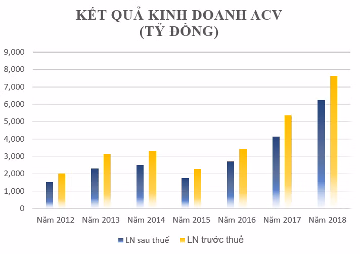 Như vậy, nếu xét theo giá trị tương đối thì có đến 3 năm liên tiếp lợi nhuận sau thuế của ACV tăng trưởng trên 50% mỗi năm. Xét về giá trị tuyệt đối, con số tăng tương ứng qua các năm lần lượt là 965 tỷ, 1.404 tỷ và 2.094 tỷ đồng vào năm 2018. Kết quả, cuối năm 2018, ACV ghi nhận khoản lợi nhuận sau thuế chưa phân phối lên tới 6.146 tỷ đồng và quỹ đầu tư phát triển 2.550 tỷ đồng.