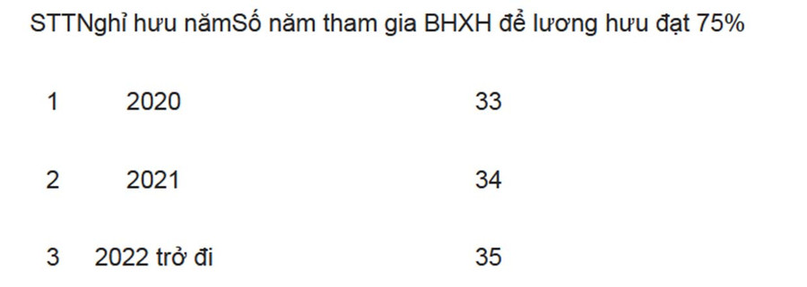 Vì thế, số năm tham gia BHXH để được hưởng lương hưu tối đa 75% của lao động nam như sau: