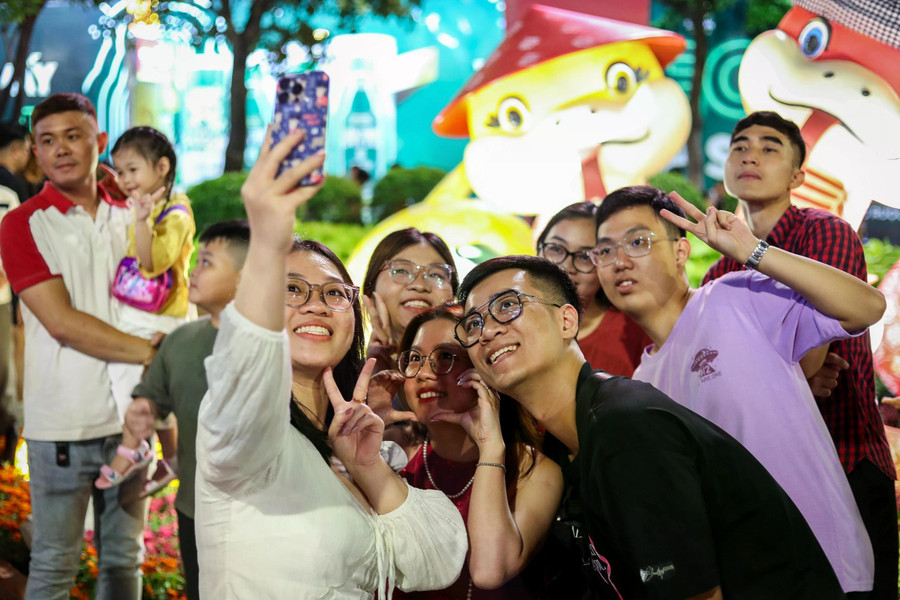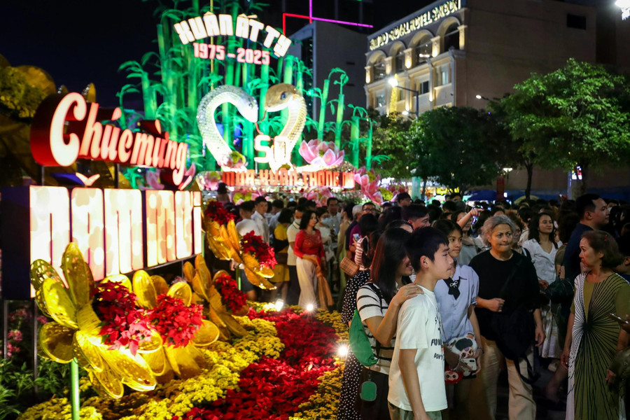 20 giờ, đường hoa Nguyễn Huệ Tết Nguyên đán Ất Tỵ 2025 chật kín giữa biển người Nhiều người tham quan đường hoa đêm giao thừa trong lúc chờ ngắm pháo hoa bắn lên từ đầu đường hầm sông Sài Gòn (TP.Thủ Đức) Các bạn trẻ hào hứng check-in tết với đường hoa