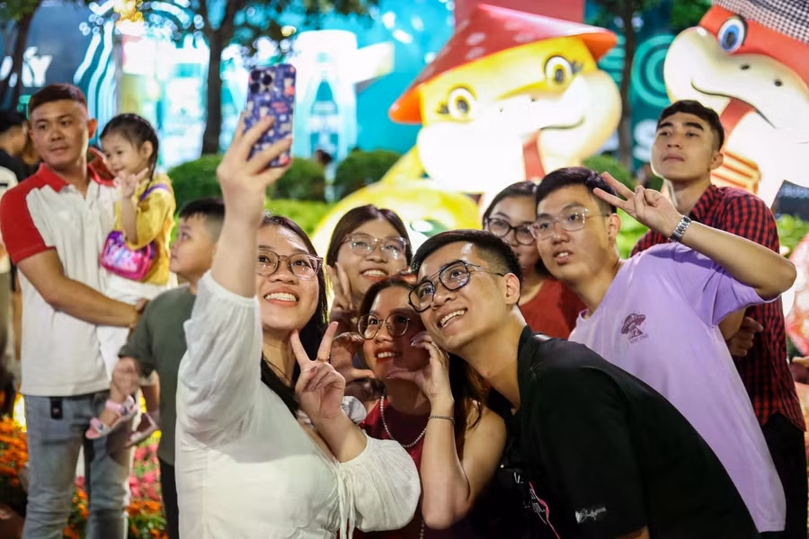 20 giờ, đường hoa Nguyễn Huệ Tết Nguyên đán Ất Tỵ 2025 chật kín giữa biển ngườiNhiều người tham quan đường hoa đêm giao thừa trong lúc chờ ngắm pháo hoa bắn lên từ đầu đường hầm sông Sài Gòn (TP.Thủ Đức)Các bạn trẻ hào hứng check-in tết với đường hoa