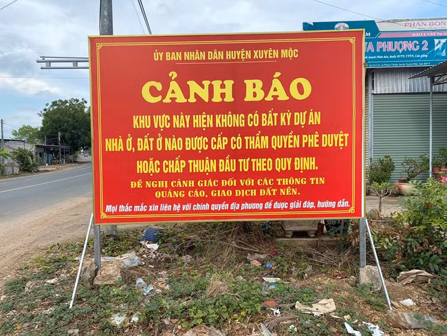 UBND huyện Xuyên Mộc đã lắp biển cảnh báo người dân không nên mua đất nền tại khu đất thuộc dự án "ma" Hồ Tràm Riverside. Ảnh: V.D