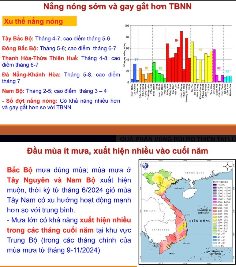 Tại hội nghị, các chuyên gia khí tượng cảnh báo, năm 2024, nắng nóng đến sớm và gay gắt hơn trung bình nhiều năm; đồng thời đầu mùa mưa sẽ ít mưa nhưng mưa lại xuất hiện nhiều vào cuối năm.