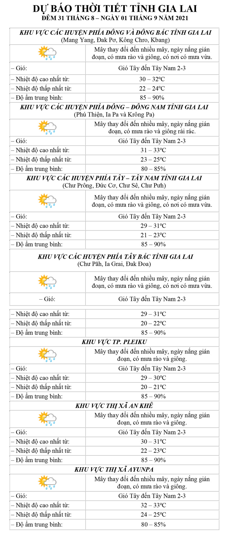 (GLO)- Dự báo thời tiết tỉnh Gia Lai đêm 31-8 và ngày 1-9 tại khu vực: các huyện phía Đông và Đông Bắc, các huyện phía Đông-Đông Nam, các huyện phía Tây-Tây Nam, các huyện phía Tây Bắc, TP. Pleiku, thị xã An Khê và thị xã Ayun Pa.
