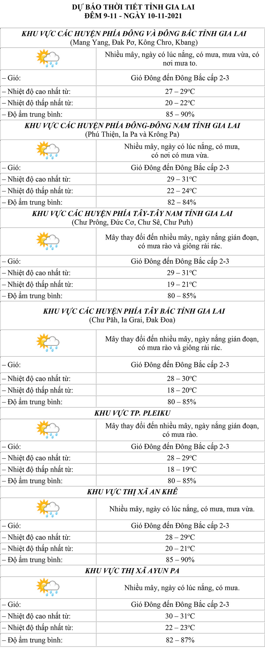 (GLO)- Dự báo thời tiết tỉnh Gia Lai đêm 9-11 và ngày 10-11 tại khu vực các huyện phía Đông và Đông Bắc, các huyện phía Đông-Đông Nam, các huyện phía Tây-Tây Nam, các huyện phía Tây Bắc, TP. Pleiku, thị xã An Khê và thị xã Ayun Pa.