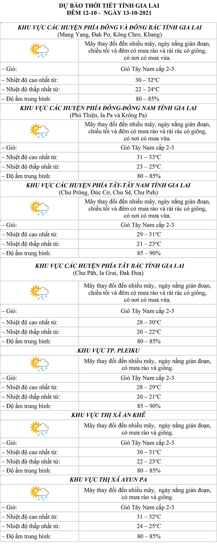 (GLO)- Dự báo thời tiết tỉnh Gia Lai đêm 12-10 và ngày 13-10 tại khu vực các huyện phía Đông và Đông Bắc, các huyện phía Đông-Đông Nam, các huyện phía Tây-Tây Nam, các huyện phía Tây Bắc, TP. Pleiku, thị xã An Khê và thị xã Ayun Pa.