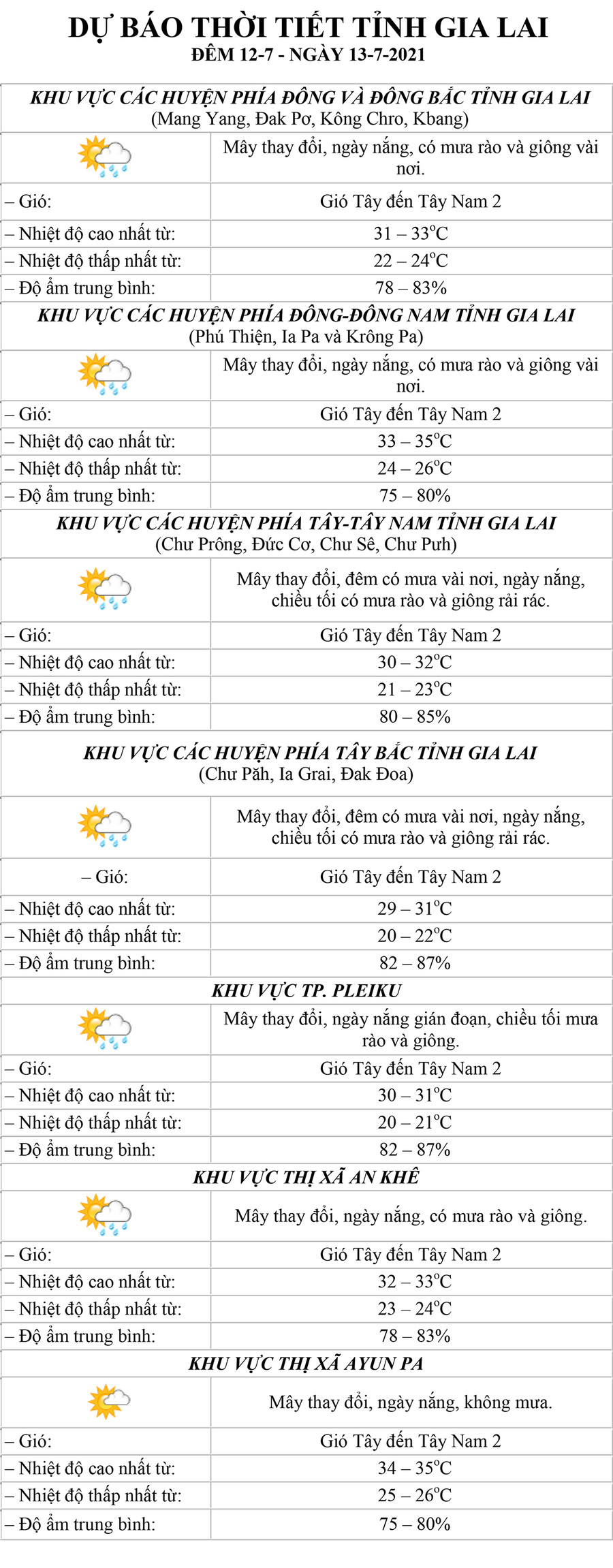 (GLO)- Dự báo thời tiết tỉnh Gia Lai đêm 12-7 và ngày 13-7 tại khu vực: các huyện phía Đông và Đông Bắc, các huyện phía Đông-Đông Nam, các huyện phía Tây-Tây Nam, các huyện phía Tây Bắc, TP. Pleiku, thị xã An Khê và thị xã Ayun Pa.