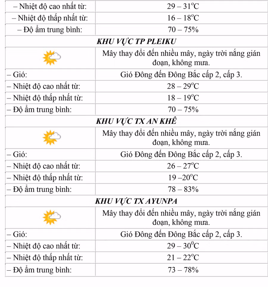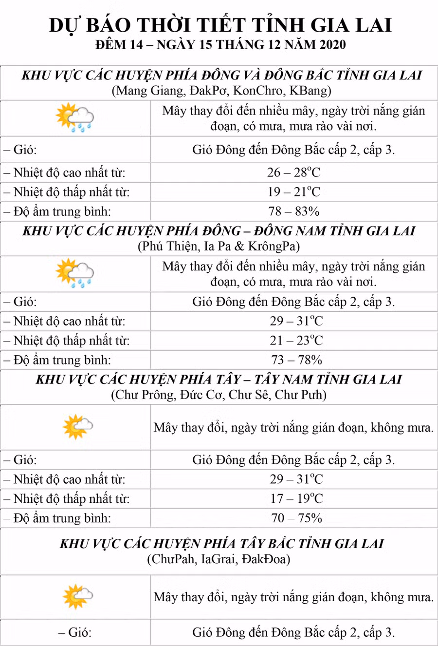(GLO)- Dự báo thời tiết tỉnh Gia Lai đêm 14-12 và ngày 15-12 tại khu vực: các huyện phía Đông và Đông Bắc, các huyện phía Đông-Đông Nam, các huyện phía Tây-Tây Nam, các huyện phía Tây Bắc, TP. Pleiku, thị xã An Khê và thị xã Ayun Pa.