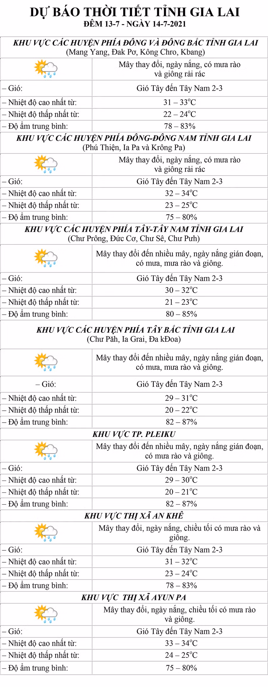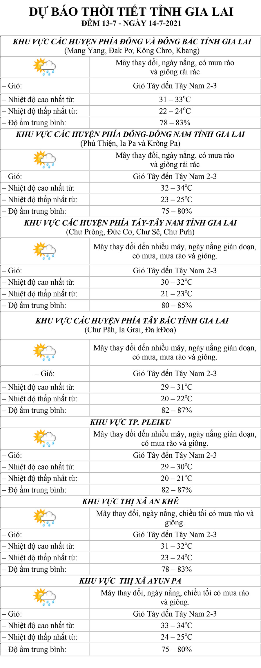 (GLO)- Dự báo thời tiết tỉnh Gia Lai đêm 13-7 và ngày 14-7 tại khu vực: các huyện phía Đông và Đông Bắc, các huyện phía Đông-Đông Nam, các huyện phía Tây-Tây Nam, các huyện phía Tây Bắc, TP. Pleiku, thị xã An Khê và thị xã Ayun Pa.