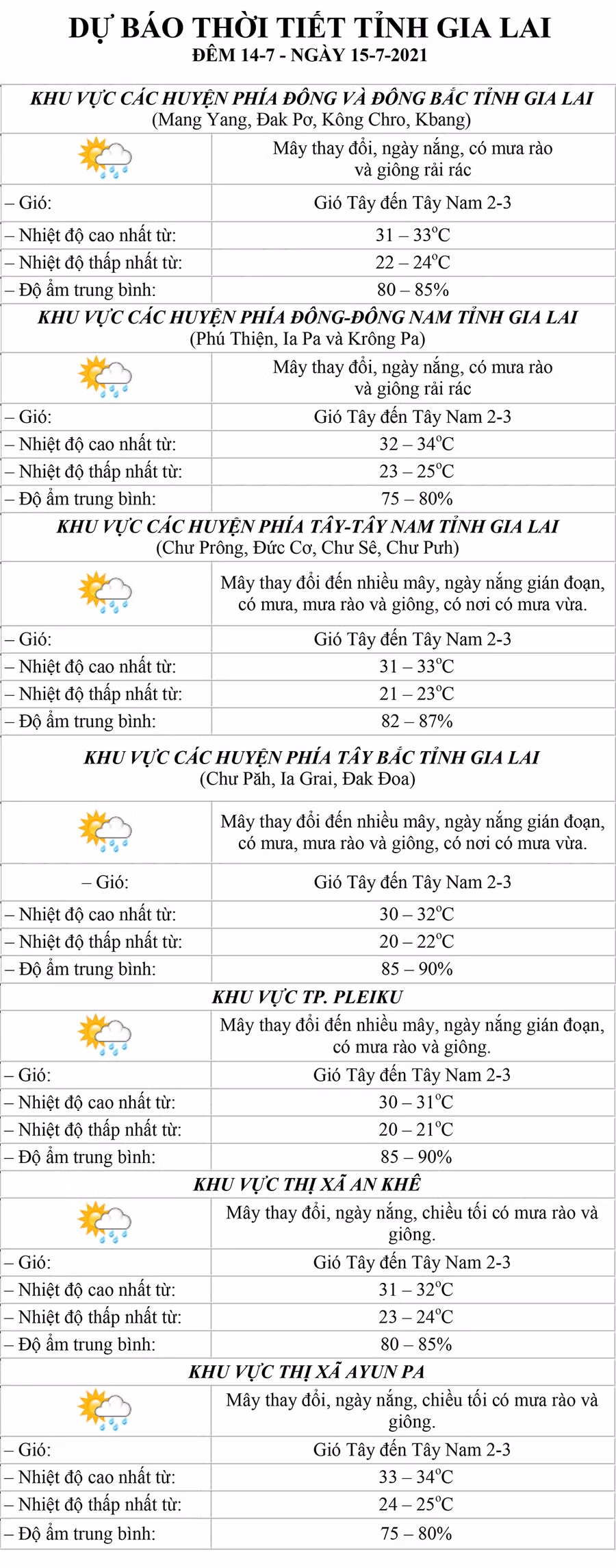 (GLO)- Dự báo thời tiết tỉnh Gia Lai đêm 14-7 và ngày 15-7 tại khu vực: các huyện phía Đông và Đông Bắc, các huyện phía Đông-Đông Nam, các huyện phía Tây-Tây Nam, các huyện phía Tây Bắc, TP. Pleiku, thị xã An Khê và thị xã Ayun Pa.