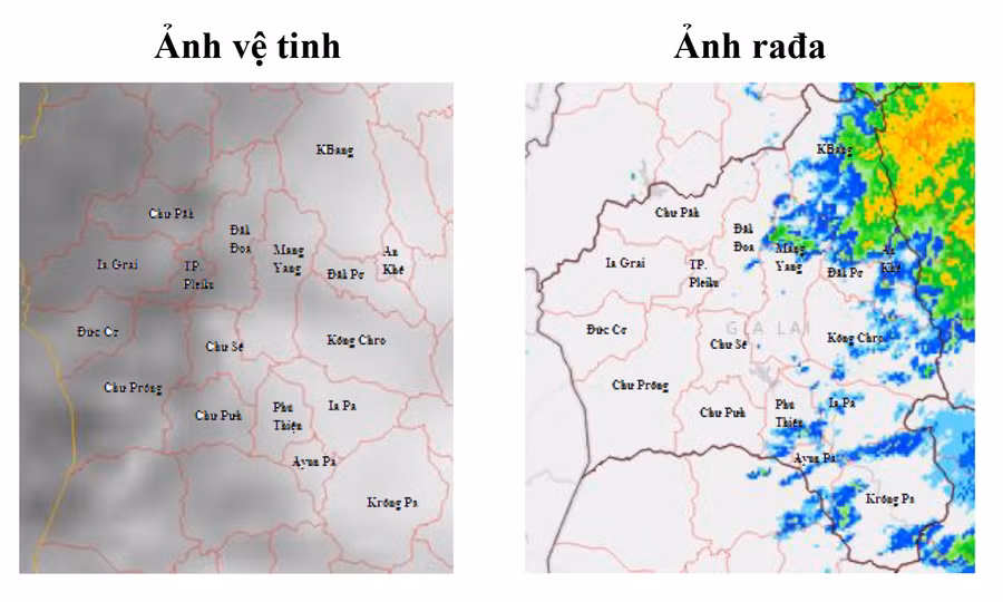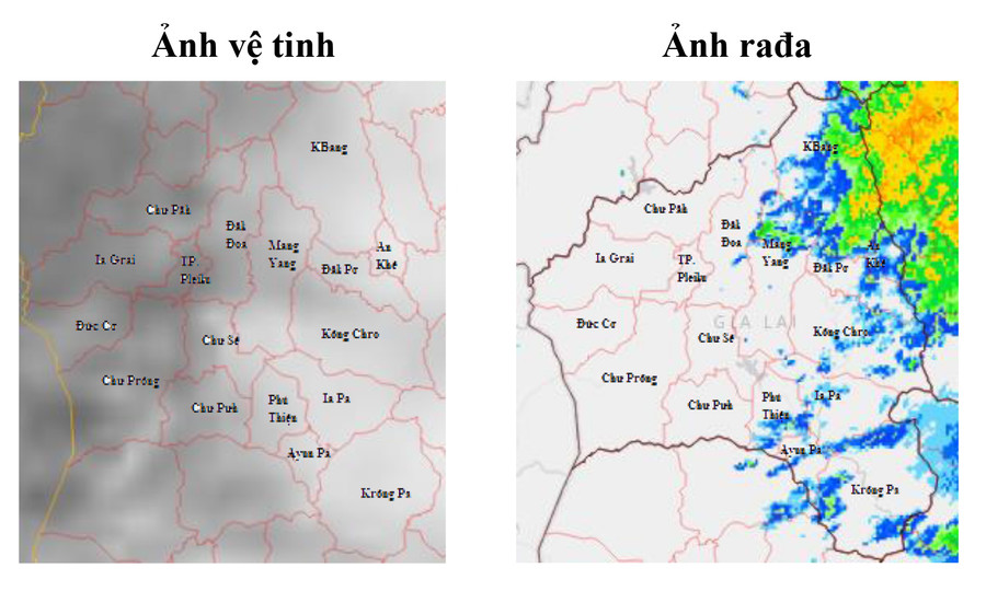 Qua theo dõi trên ảnh ra đa thời tiết Pleiku, ảnh mây vệ tinh cho thấy những vùng mây đối lưu tồn tại trên khu vực các huyện Đak Pơ, Kbang, Mang Yang và thị xã An Khê. Hiện tại những vùng mây này có xu hướng phát triển và mở rộng thêm.