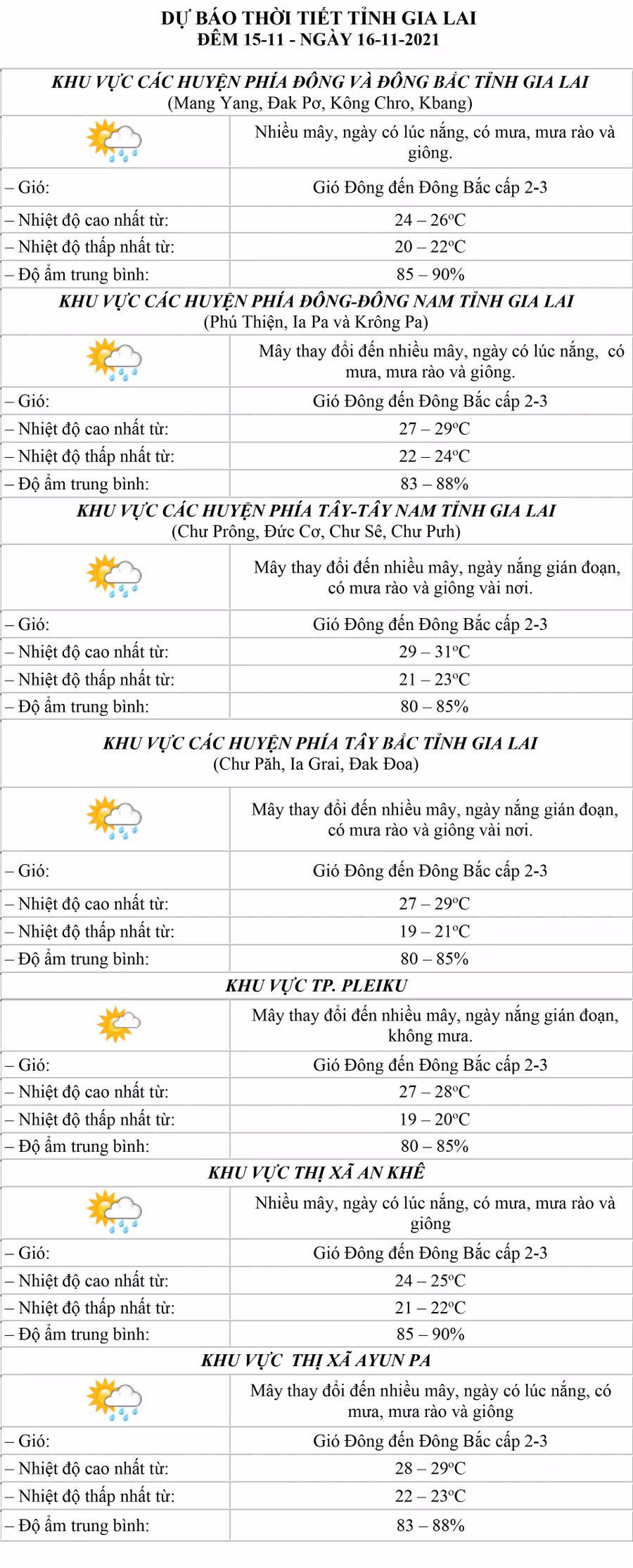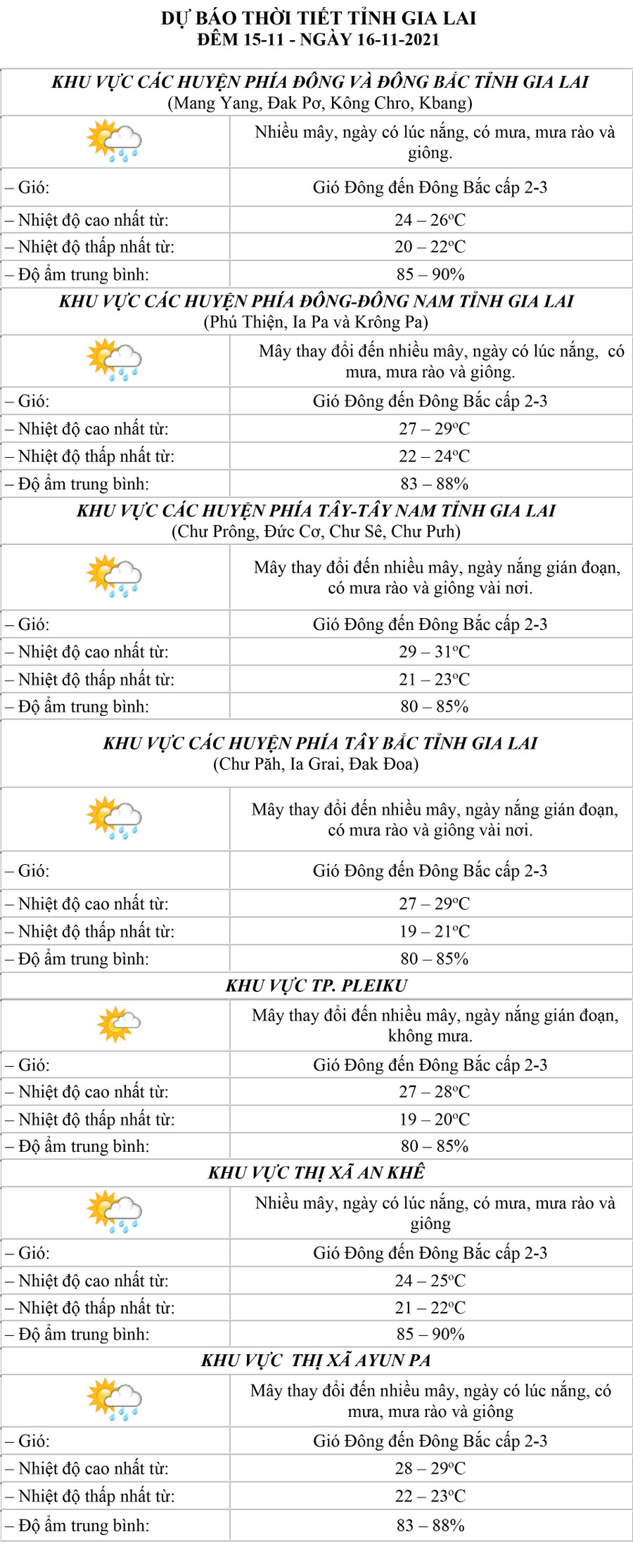 (GLO)- Dự báo thời tiết tỉnh Gia Lai đêm 15-11 và ngày 16-11 tại khu vực các huyện phía Đông và Đông Bắc, các huyện phía Đông-Đông Nam, các huyện phía Tây-Tây Nam, các huyện phía Tây Bắc, TP. Pleiku, thị xã An Khê và thị xã Ayun Pa.