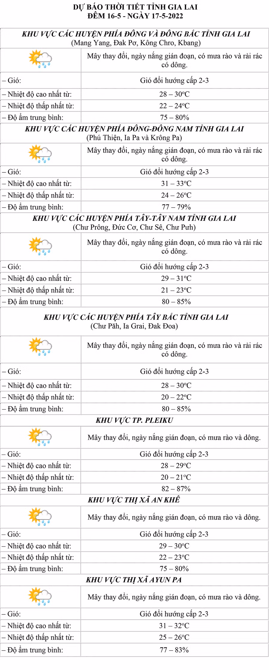 (GLO)- Dự báo thời tiết tỉnh Gia Lai đêm 16-5 và ngày 17-5 tại khu vực các huyện phía Đông và Đông Bắc, các huyện phía Đông-Đông Nam, các huyện phía Tây-Tây Nam, các huyện phía Tây Bắc, TP. Pleiku, thị xã An Khê và Ayun Pa.