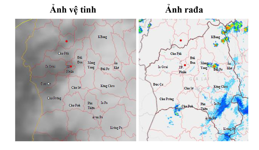 Qua theo dõi trên ảnh ra đa thời tiết Pleiku, ảnh mây vệ tinh cho thấy những vùng mây đối lưu tồn tại trên khu vực huyện Kbang, Đak Pơ. Hiện tại những vùng mây này tiếp tục phát triển và mở rộng thêm.