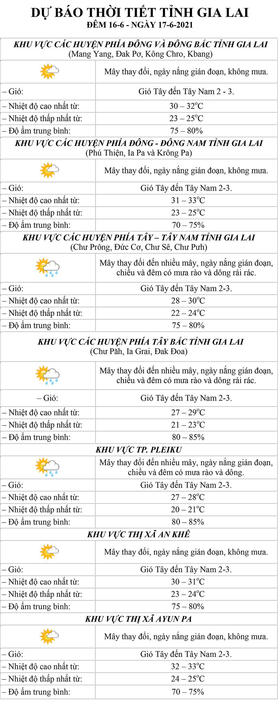 (GLO)- Dự báo thời tiết tỉnh Gia Lai đêm 16-6 và ngày 17-6 tại khu vực: các huyện phía Đông và Đông Bắc, các huyện phía Đông-Đông Nam, các huyện phía Tây-Tây Nam, các huyện phía Tây Bắc, TP. Pleiku, thị xã An Khê và thị xã Ayun Pa.
