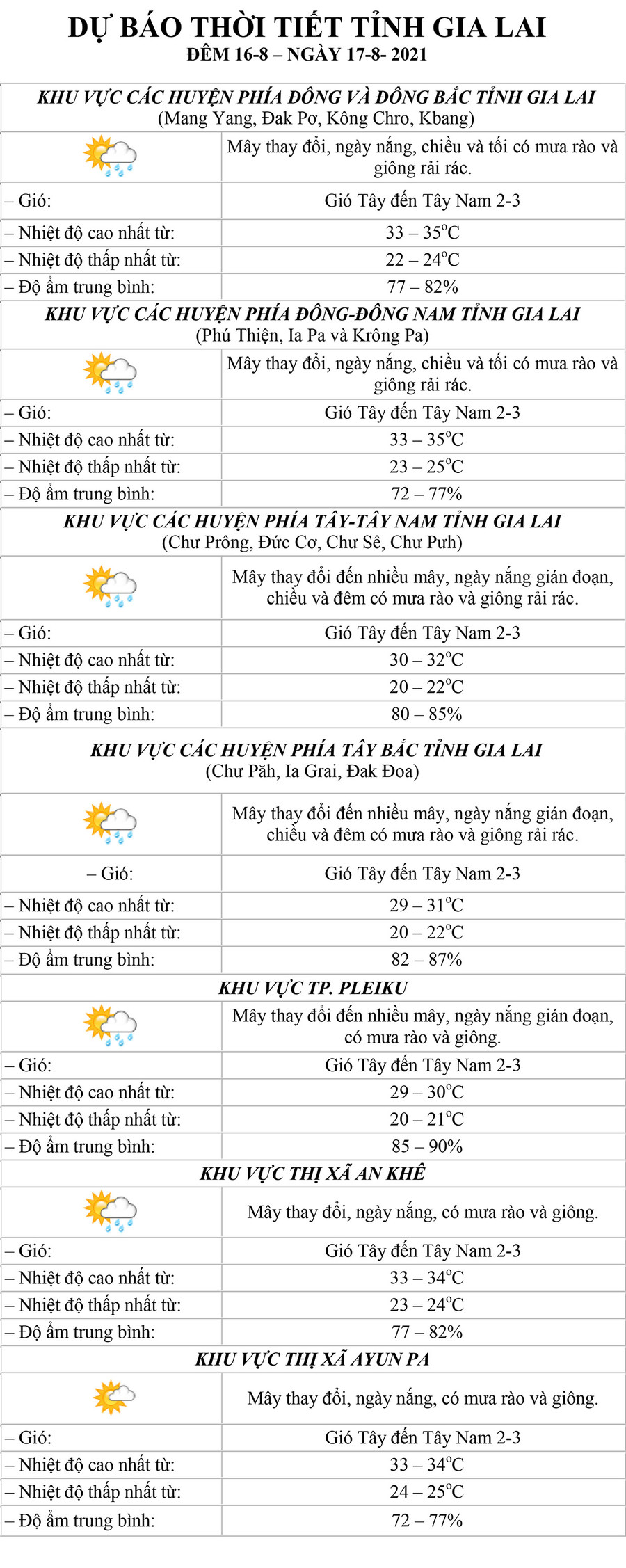 (GLO)- Dự báo thời tiết tỉnh Gia Lai đêm 16-8 và ngày 17-8 tại khu vực: các huyện phía Đông và Đông Bắc, các huyện phía Đông-Đông Nam, các huyện phía Tây-Tây Nam, các huyện phía Tây Bắc, TP. Pleiku, thị xã An Khê và thị xã Ayun Pa.