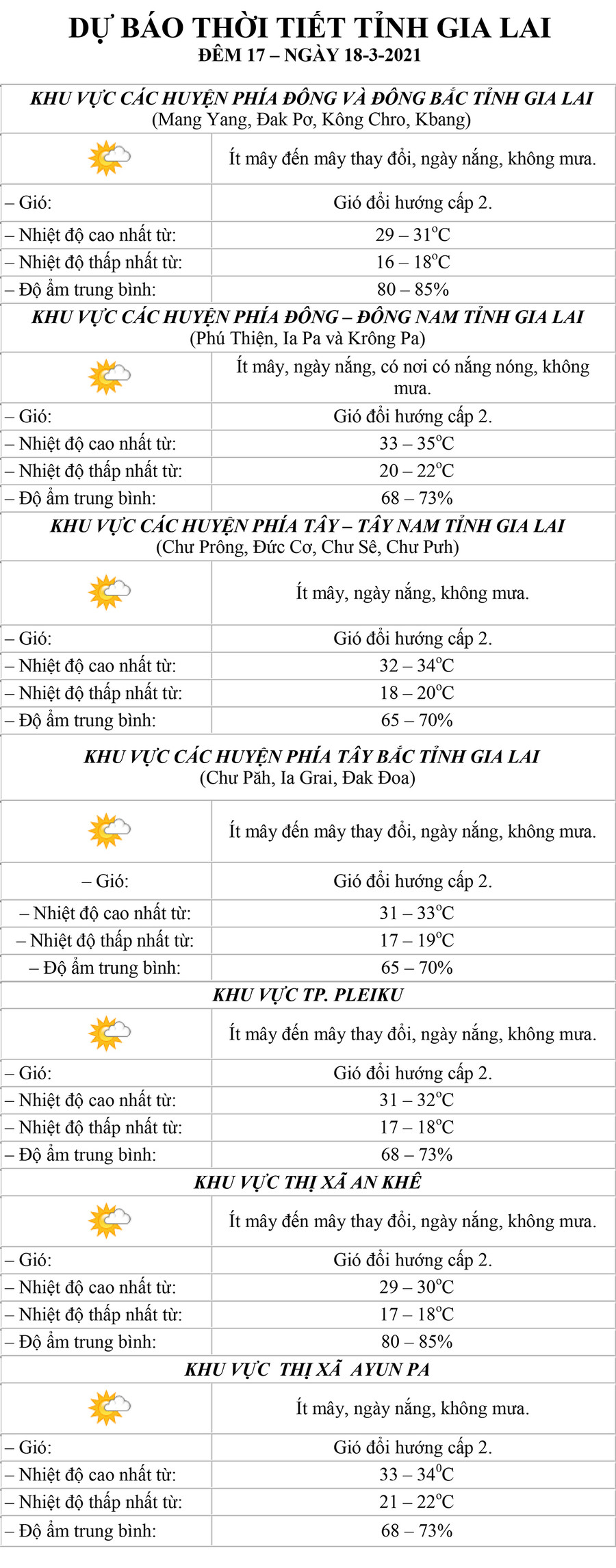 (GLO)- Dự báo thời tiết tỉnh Gia Lai đêm 17-3 và ngày 18-3 tại khu vực: các huyện phía Đông và Đông Bắc, các huyện phía Đông-Đông Nam, các huyện phía Tây-Tây Nam, các huyện phía Tây Bắc, TP. Pleiku, thị xã An Khê và thị xã Ayun Pa.