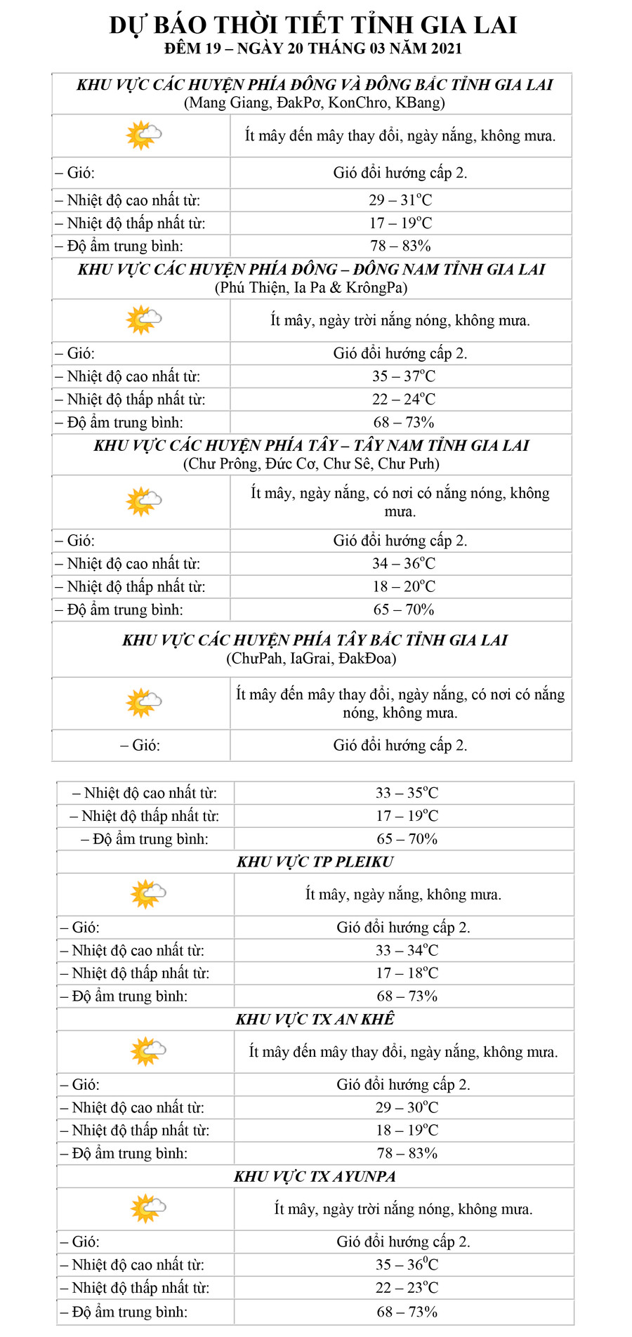 (GLO)- Dự báo thời tiết tỉnh Gia Lai đêm 19-3 và ngày 20-3 tại khu vực: các huyện phía Đông và Đông Bắc, các huyện phía Đông-Đông Nam, các huyện phía Tây-Tây Nam, các huyện phía Tây Bắc, TP. Pleiku, thị xã An Khê và thị xã Ayun Pa.