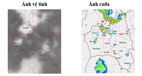 Qua theo dõi trên ảnh ra đa thời tiết Pleiku và ảnh mây vệ tinh cho thấy những vùng mây đối lưu tồn tại trên khu vực các huyện Kbang, Đak Đoa, Chư Păh, Ia Grai, Đức Cơ, Krông Pa và TP. Pleiku. Hiện tại những vùng mây này có xu hướng phát triển và mở rộng thêm.