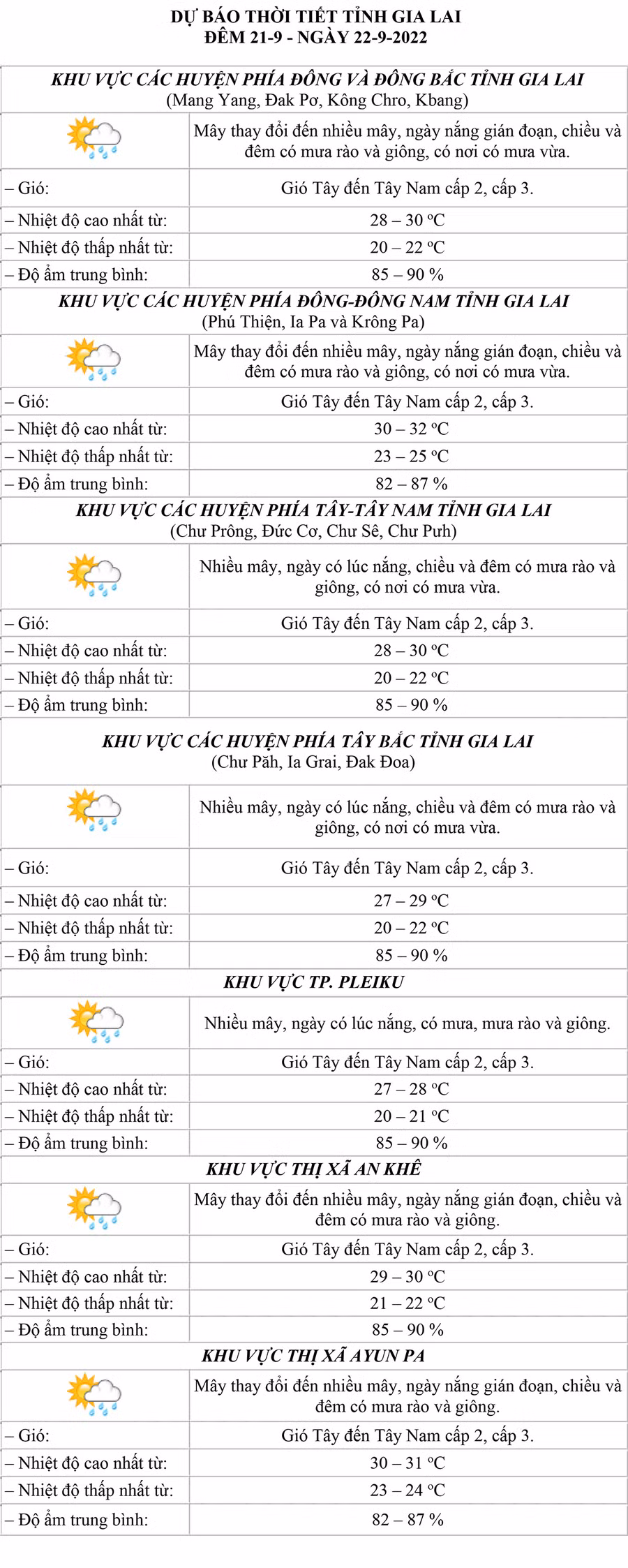 (GLO)- Dự báo thời tiết tỉnh Gia Lai đêm 21 và ngày 22-9 tại khu vực các huyện phía Đông-Đông Bắc, các huyện phía Đông-Đông Nam, các huyện phía Tây-Tây Nam, các huyện phía Tây Bắc, TP. Pleiku, thị xã An Khê và thị xã Ayun Pa.