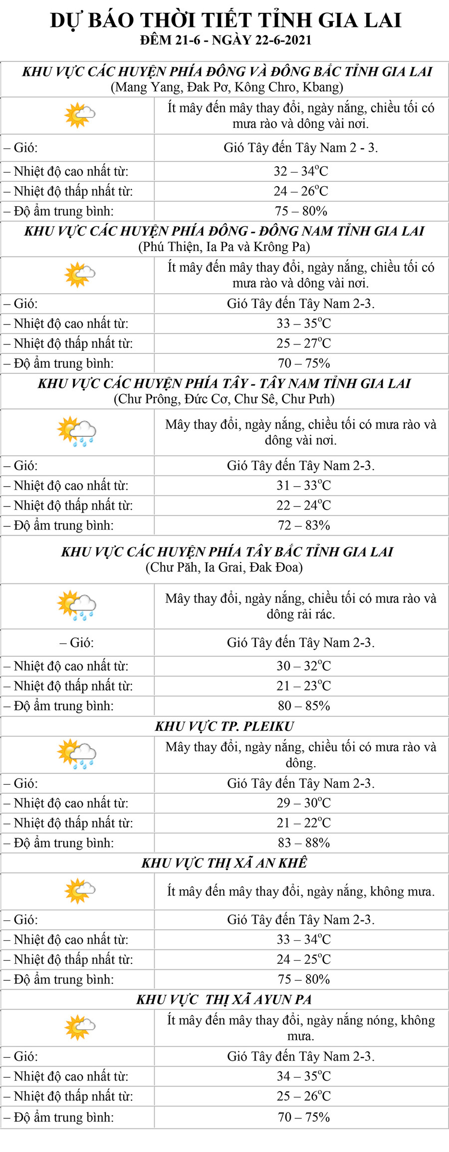 (GLO)- Dự báo thời tiết tỉnh Gia Lai đêm 22-6 và ngày 23-6 tại khu vực: các huyện phía Đông và Đông Bắc, các huyện phía Đông-Đông Nam, các huyện phía Tây-Tây Nam, các huyện phía Tây Bắc, TP. Pleiku, thị xã An Khê và thị xã Ayun Pa.
