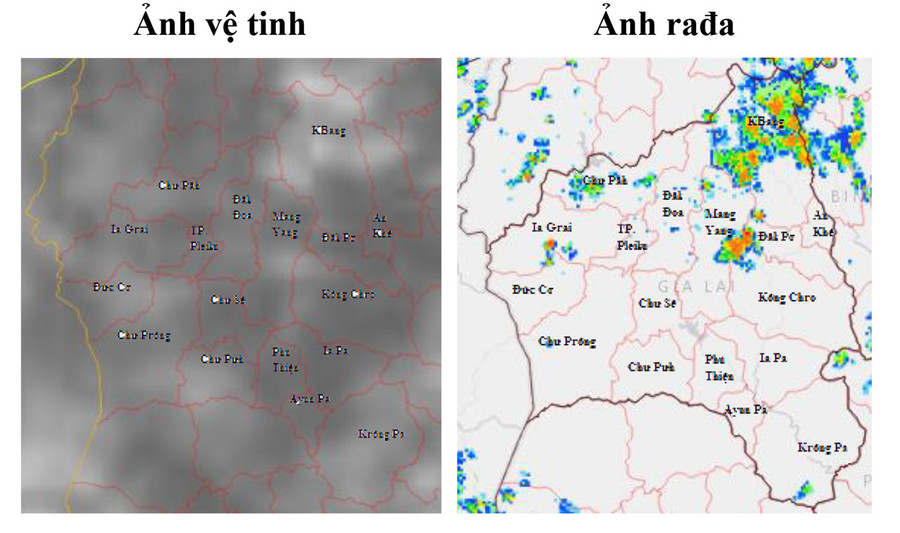 Qua theo dõi trên ảnh ra đa thời tiết Pleiku, ảnh mây vệ tinh cho thấy những vùng mây đối lưu tồn tại trên khu vực các huyện: Kbang, Đak Pơ, Kông Chro, Mang Yang, Đak Đoa, Chư Păh, Ia Grai, Krông Pa. Hiện tại những vùng mây này có xu hướng phát triển và mở rộng thêm.