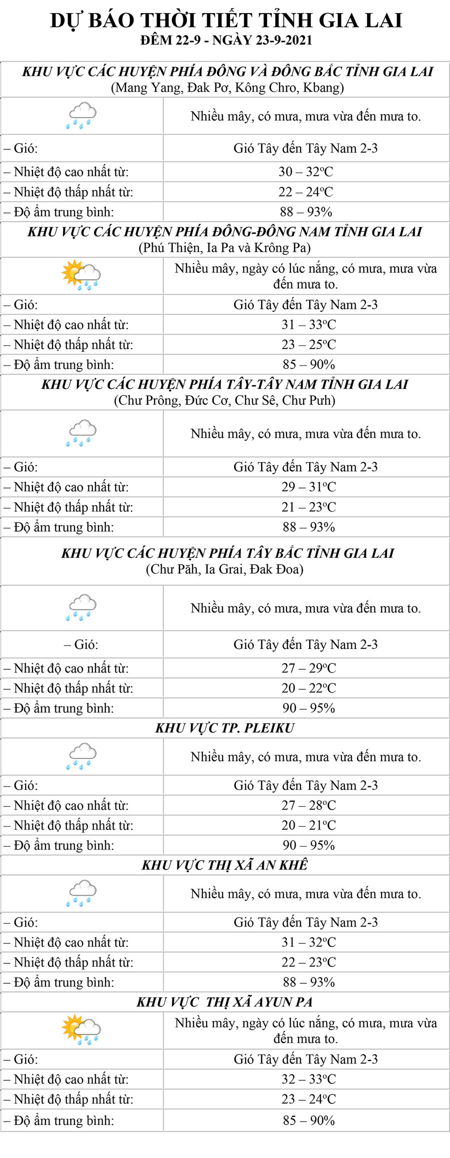 (GLO)- Dự báo thời tiết tỉnh Gia Lai đêm 22-9 và ngày 23-9 tại khu vực: các huyện phía Đông và Đông Bắc, các huyện phía Đông-Đông Nam, các huyện phía Tây-Tây Nam, các huyện phía Tây Bắc, TP. Pleiku, thị xã An Khê và thị xã Ayun Pa.