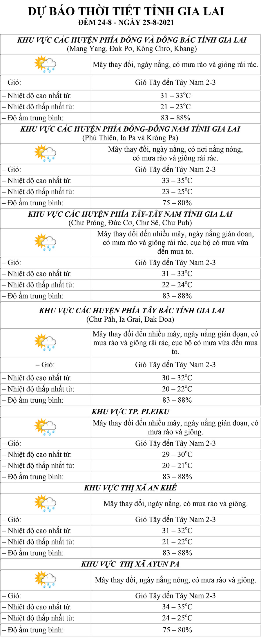 (GLO)- Dự báo thời tiết tỉnh Gia Lai đêm 24-8 và ngày 25-8 tại khu vực: các huyện phía Đông và Đông Bắc, các huyện phía Đông-Đông Nam, các huyện phía Tây-Tây Nam, các huyện phía Tây Bắc, TP. Pleiku, thị xã An Khê và thị xã Ayun Pa.