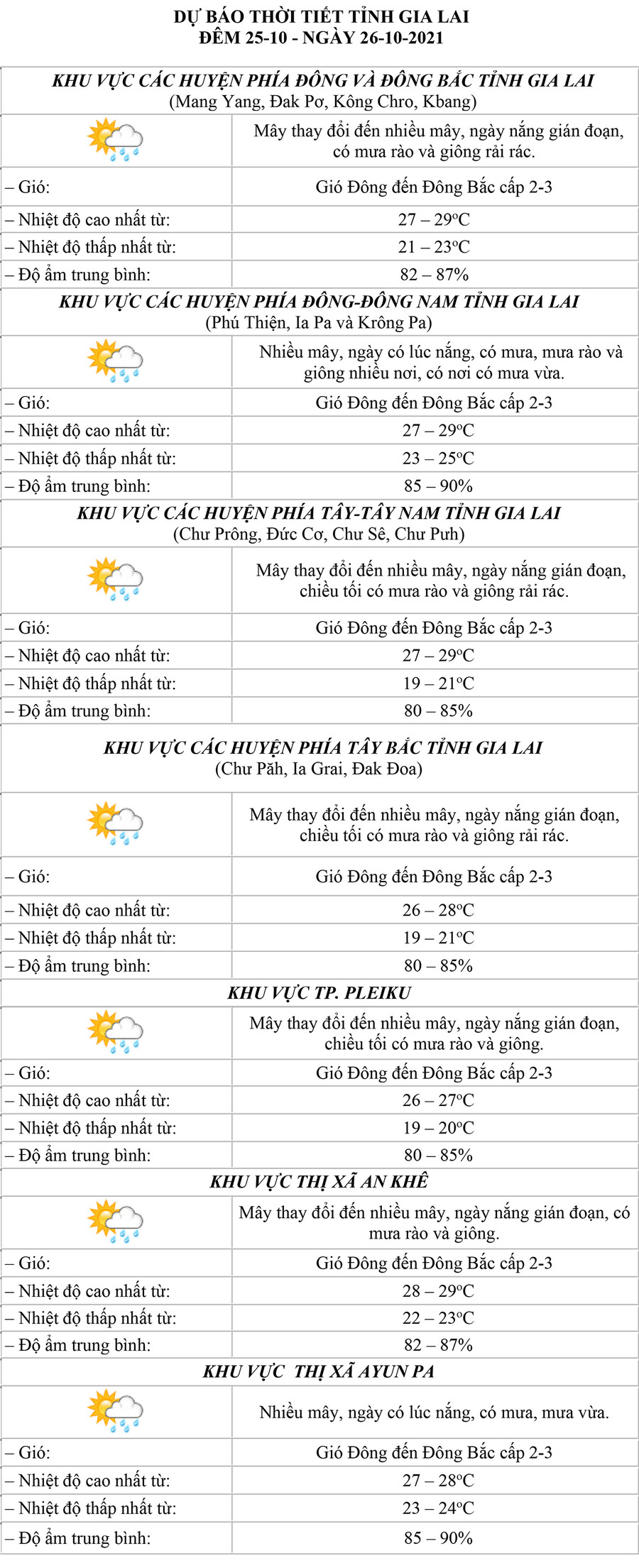 (GLO)- Dự báo thời tiết tỉnh Gia Lai đêm 25-10 và ngày 26-10 tại khu vực: các huyện phía Đông và Đông Bắc, các huyện phía Đông-Đông Nam, các huyện phía Tây-Tây Nam, các huyện phía Tây Bắc, TP. Pleiku, thị xã An Khê và thị xã Ayun Pa.