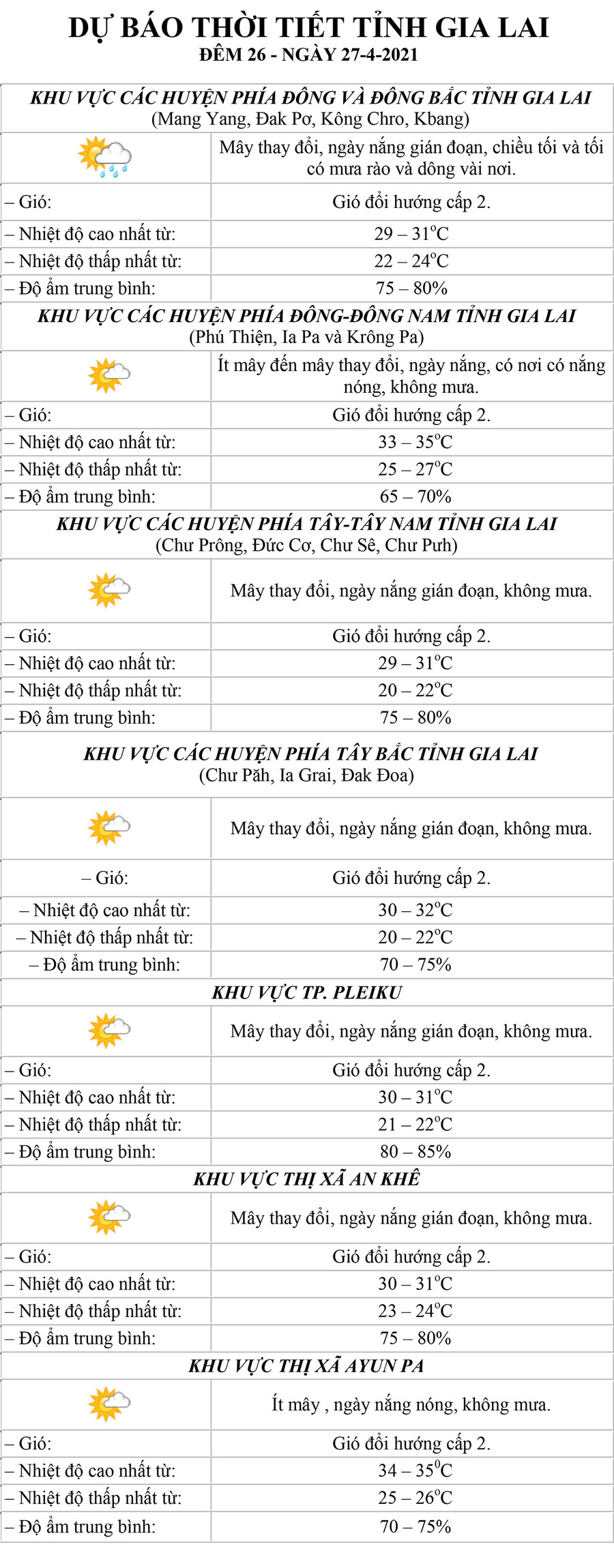 (GLO)- Dự báo thời tiết tỉnh Gia Lai đêm 26-4 và ngày 27-4 tại khu vực: các huyện phía Đông và Đông Bắc, các huyện phía Đông-Đông Nam, các huyện phía Tây-Tây Nam, các huyện phía Tây Bắc, TP. Pleiku, thị xã An Khê và thị xã Ayun Pa.