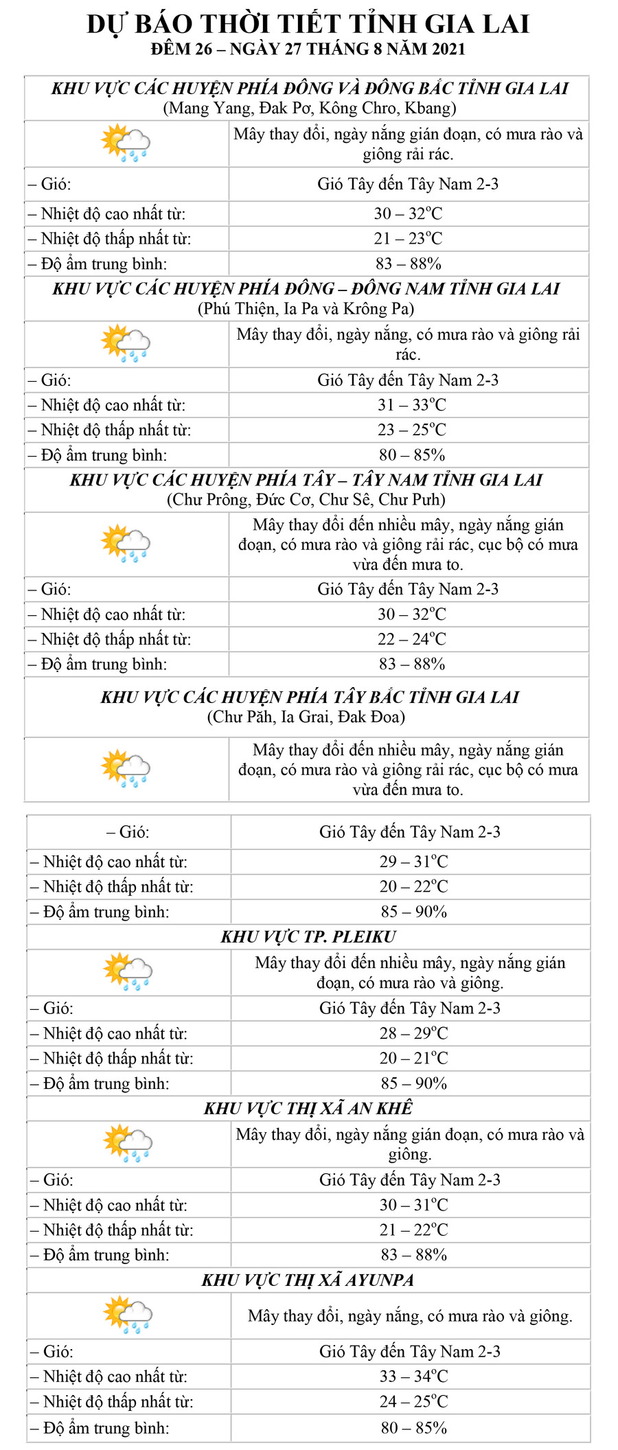 (GLO)- Ngày 25-10, Đài Khí tượng thủy văn tỉnh Gia Lai phát đi bản tin dự báo thời tiết ở các khu vực trong tỉnh, cùng với cảnh báo đề phòng mưa giông kèm theo các hiện tượng lốc, sét có thể gây tốc mái nhà, gãy đổ cây cối, làm bị thương người và vật nuôi.