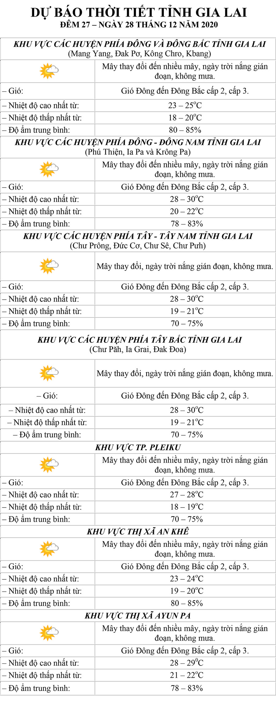 (GLO)- Dự báo thời tiết tỉnh Gia Lai đêm 27-12 và ngày 28-12 tại khu vực: các huyện phía Đông và Đông Bắc, các huyện phía Đông-Đông Nam, các huyện phía Tây-Tây Nam, các huyện phía Tây Bắc, TP. Pleiku, thị xã An Khê và thị xã Ayun Pa.